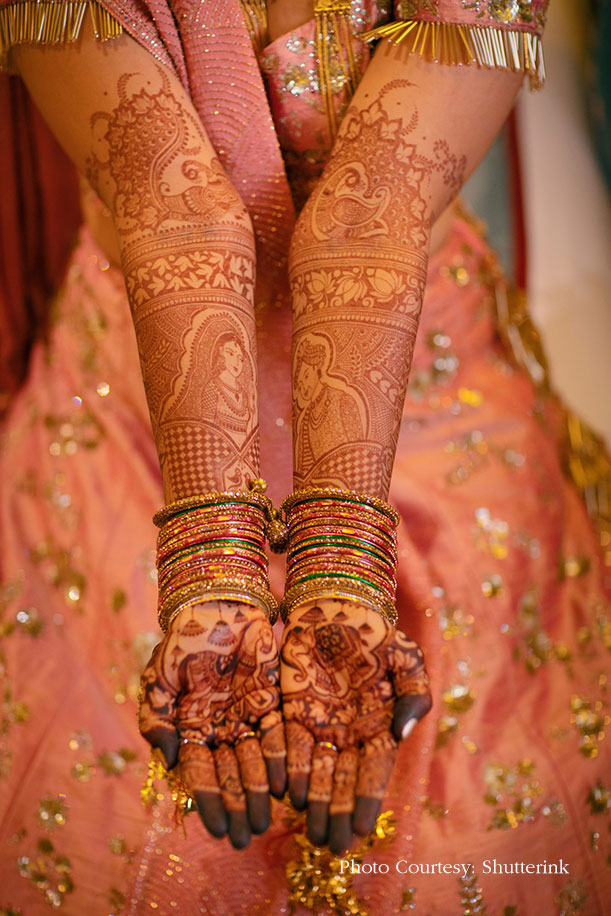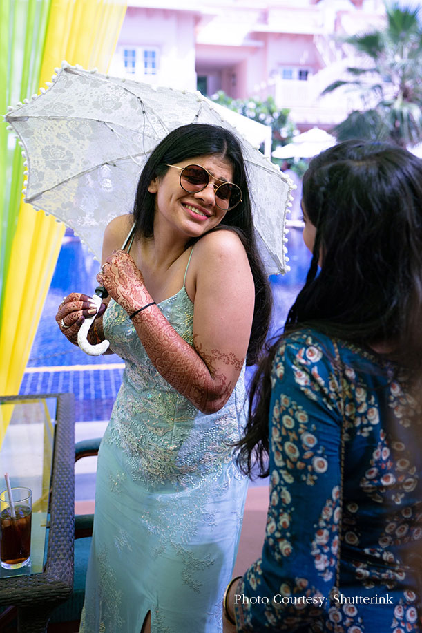 “We wanted our mehndi to be unconventional and youthful with an unmissable Indian touch, so we went with decorations that clubbed origami elements with peacock feathers. A Laughing Buddha and the Hamsa Hand were also a part of the colorful decorations.”