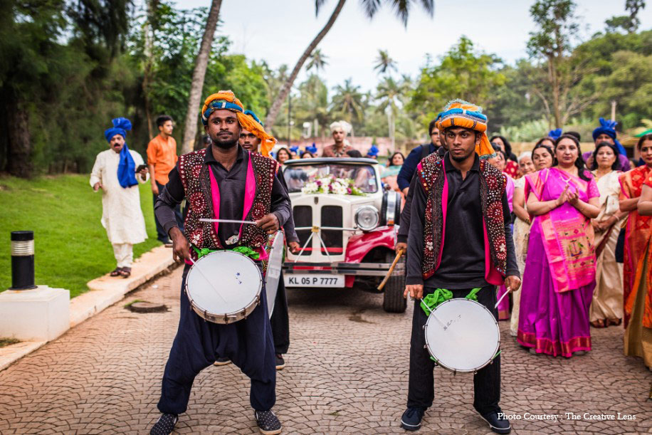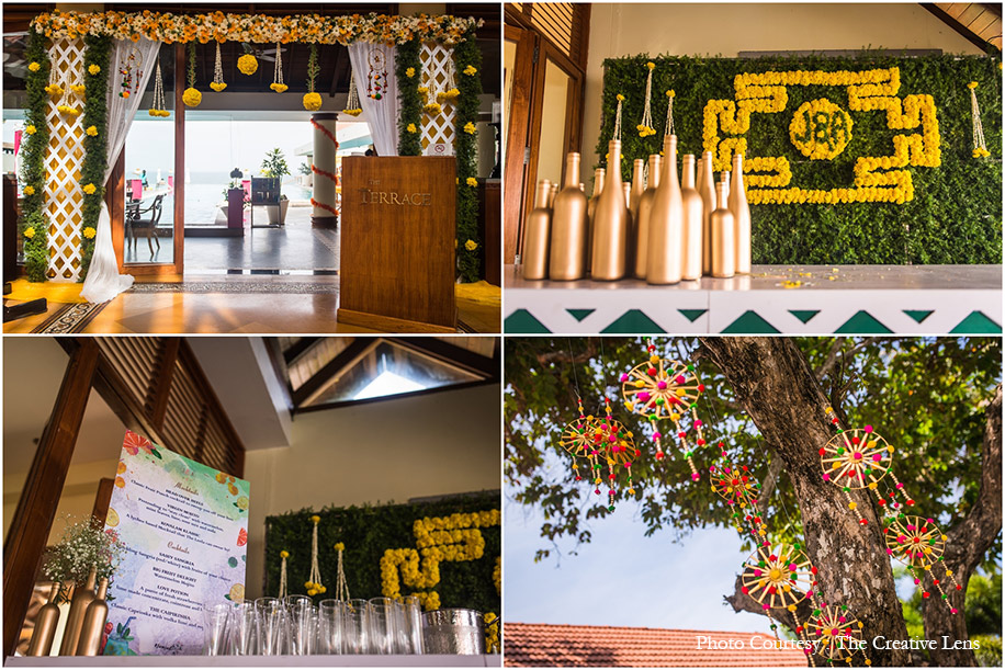 “Since we were in Kerala, we wanted to give our guests a taste of the place, quite literally! Though this wasn’t a function, it was a unique occasion. The lunch was set up on a long table where banana leaves were laid out, and the hotel staff served everyone a lovely Kerala style meal. This came highly recommended by the hotel, and we weren’t disappointed one bit. To add to the mood, we gave our guests traditional white dhotis and sarees and had people present there who helped them draped those.”