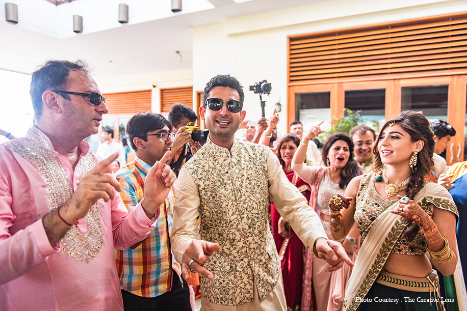 “We had our mehndi at ‘The Terrace’ which was by the pool. Since this was the first event, we wanted people to relax and get ready for all that was to follow. Keeping this in mind we had called a few masseuses to give our friends and family shoulder and foot massages. The colors that were used as part of decor were yellow, orange, white and green. A cart with giveaways and favors was set up at the venue. We had traditional singers and drummers at the venue too to set the mood. For this event, I picked a green and golden lehenga by Sawan Gandhi in New Delhi.”
