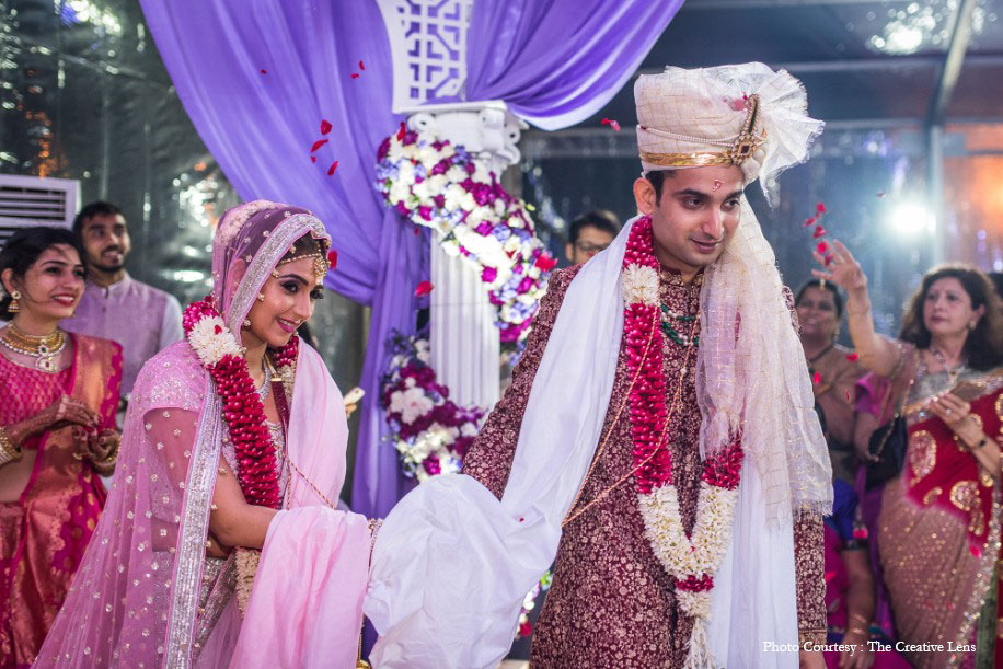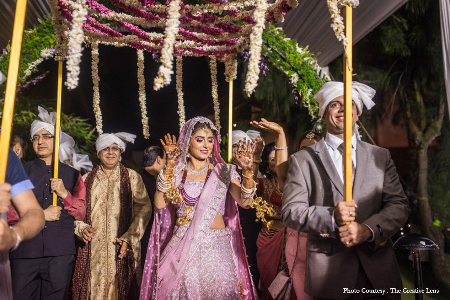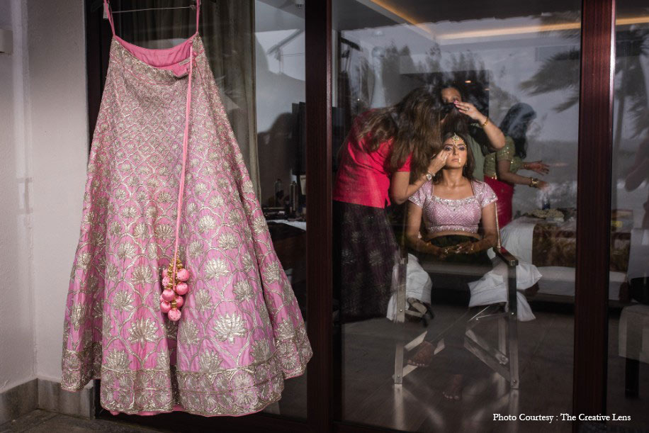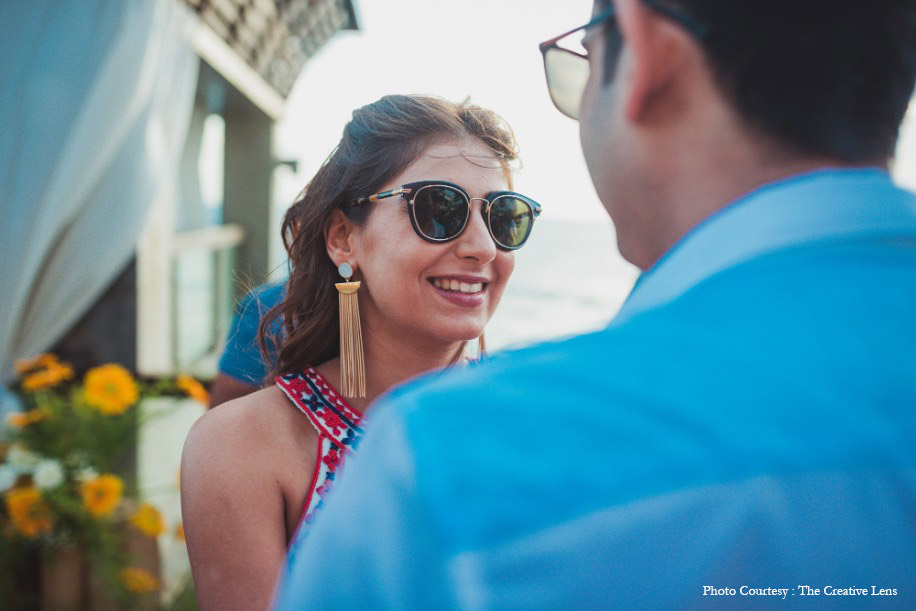 “We decided to have an unconventional order of events by hosting the wedding on the first day itself. We wanted to enjoy our wedding and party hard. However, when the wedding is scheduled as one of the latter functions, the bride and the groom often don’t end up indulging in all the madness because they want to sleep well and not look hungover on the big day. So, we got married at the beach. The ceremony began in the evening and got over by the time night had set in. The weather was pleasant, and the setting proved to be perfect. We went with a white and lilac color scheme for this function. Since the location of so peaceful and pretty, we didn’t want bold colors to take away from its natural beauty. We had artists who sang for each phera and the sounds of the waves served as the background score.I wore a baby pink lehenga by Prerna Nagpal for this event.”
