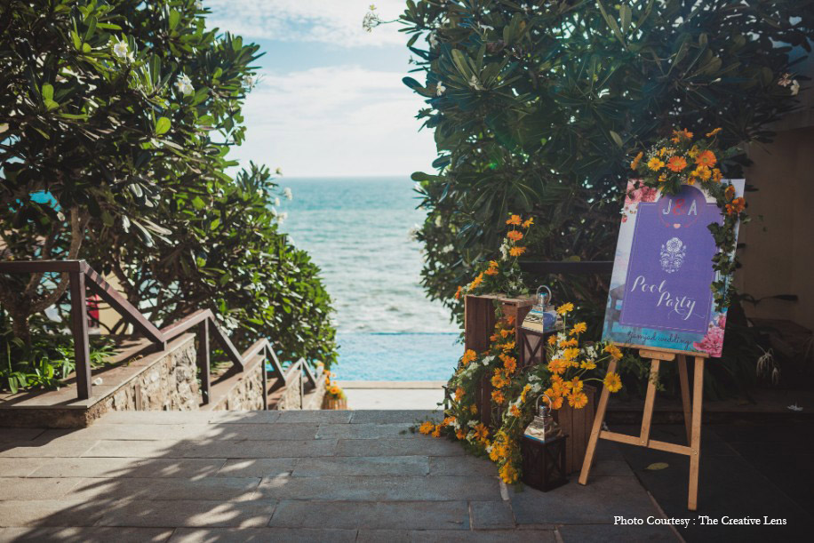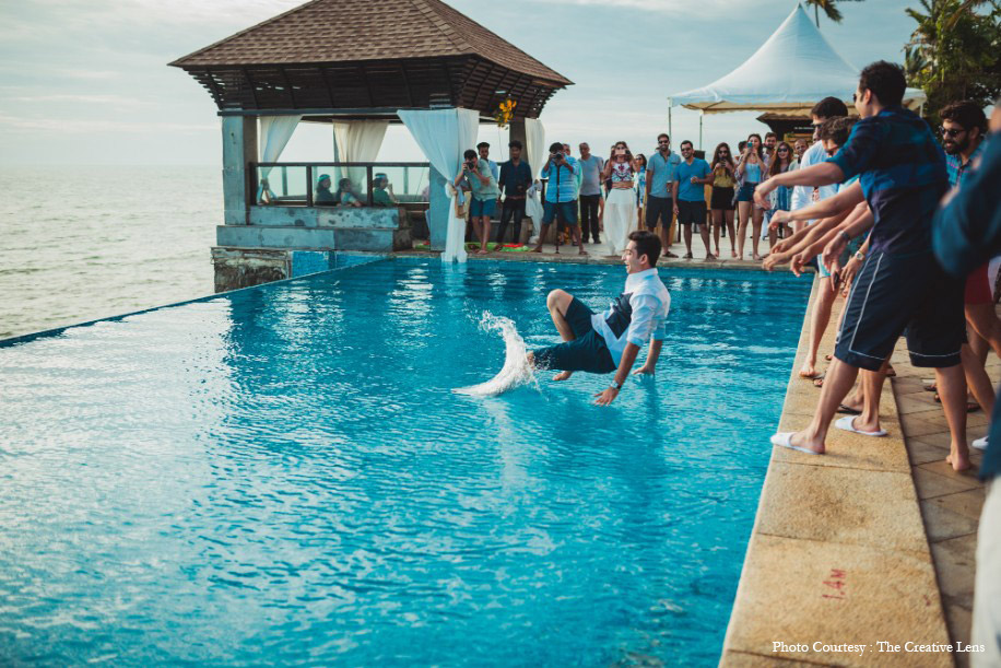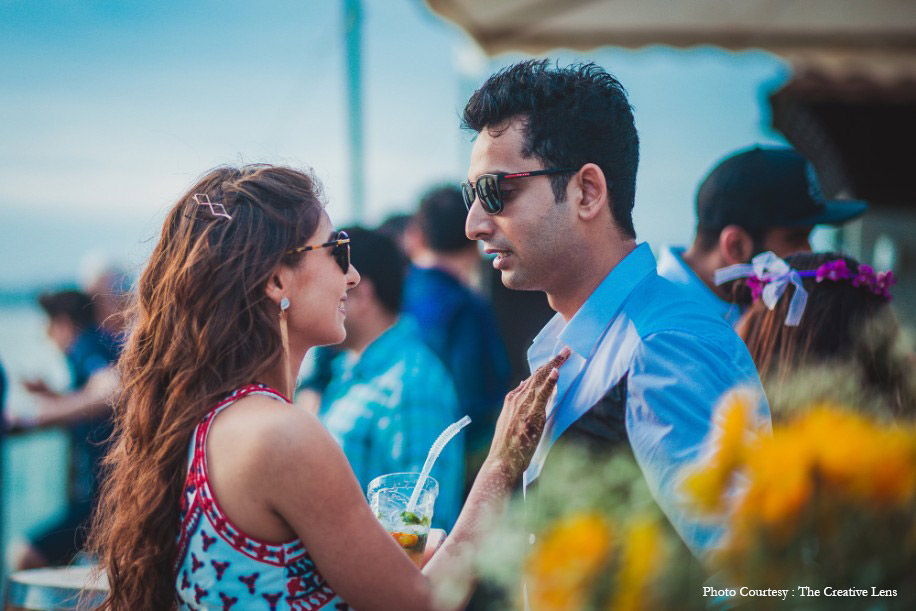 “Our sundowner pool party was held at the infinity pool which wasn’t a venue that was easy to get, but no other place could have been more perfect. We had decorated the area with baby’s breath blooms, white drapes and planks of wood to add a rustic looks. Canopies were set up, food was laid out inside the restaurant, and relaxing music played in the background. You could see the wide expanse of the sea and the weather that day was quite windy. We had beer pong, sheesha, and cocktails for guests to enjoy. Since this was a pool party, I was very particular about the fabric for my outfit. Prerna Nagpal designed my attire using scuba fabric. I wore shorts that came with a wrap-around skirt and a crop top.”