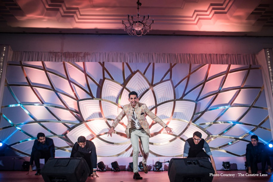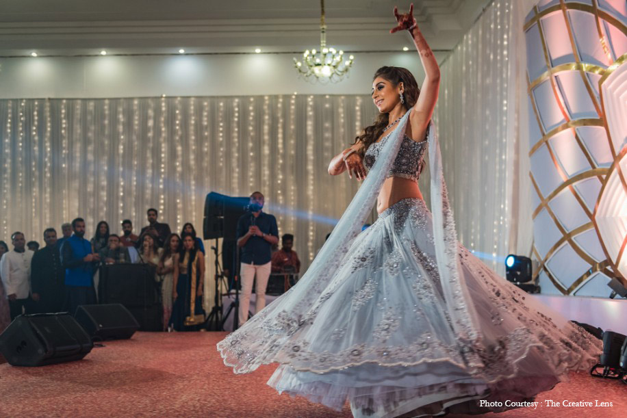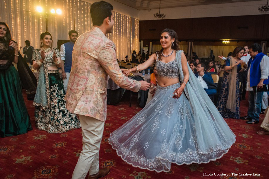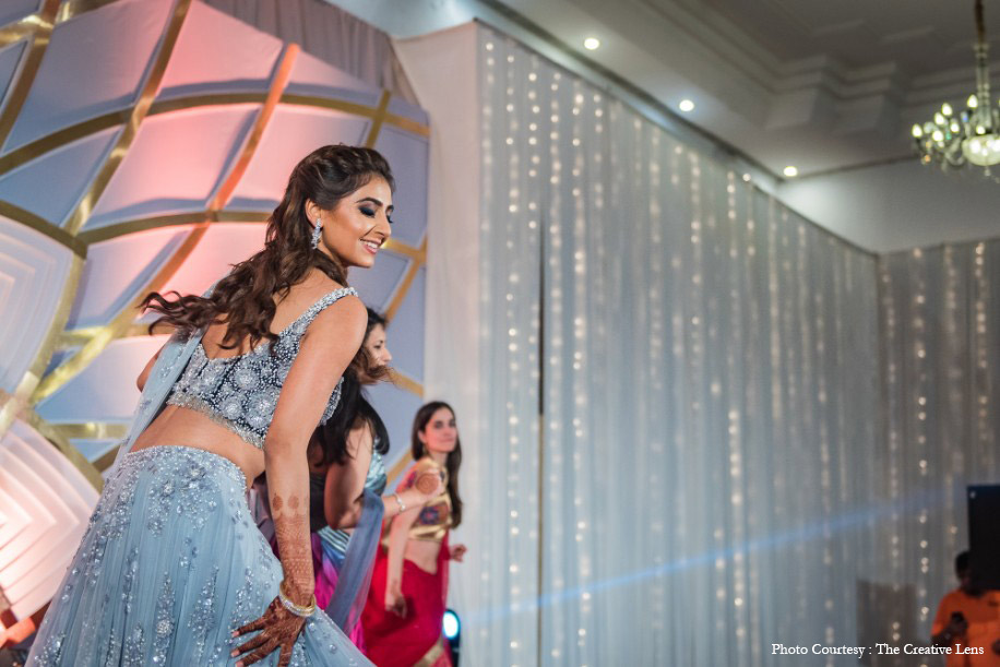 “My father-in-law arranged for a surprise for the two of us during this function. Just before we entered the banquet, he had members from both the families create a tunnel by joining their hands for us to walk through. It was a simple yet touching way to see both the families come together to celebrate our union. The backdrop of our stage was gorgeous. We had a golden laser-cut lotus made of acrylic. I wore a sky blue lehenga by Natasha Dalal for this function.”