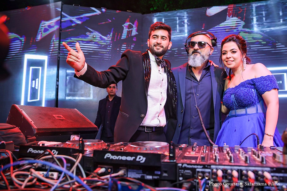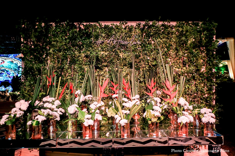 The festivities began on a high note with a stunning Cocktail function themed around an ‘Enchanted garden’. Lush tropical decor combined with the glitz of chandeliers, striking floral arrangements, crystal props and a show-stopping glass unicorn that set a magical ambience. Dressed in a striking royal blue gown and tuxedo respectively, the couple arrived to great cheer and a show of cold pyro.