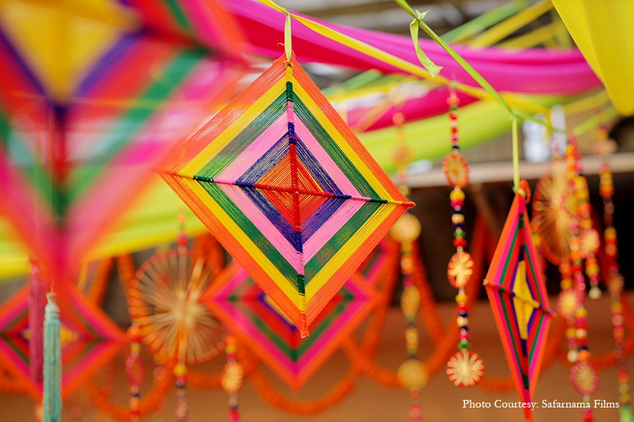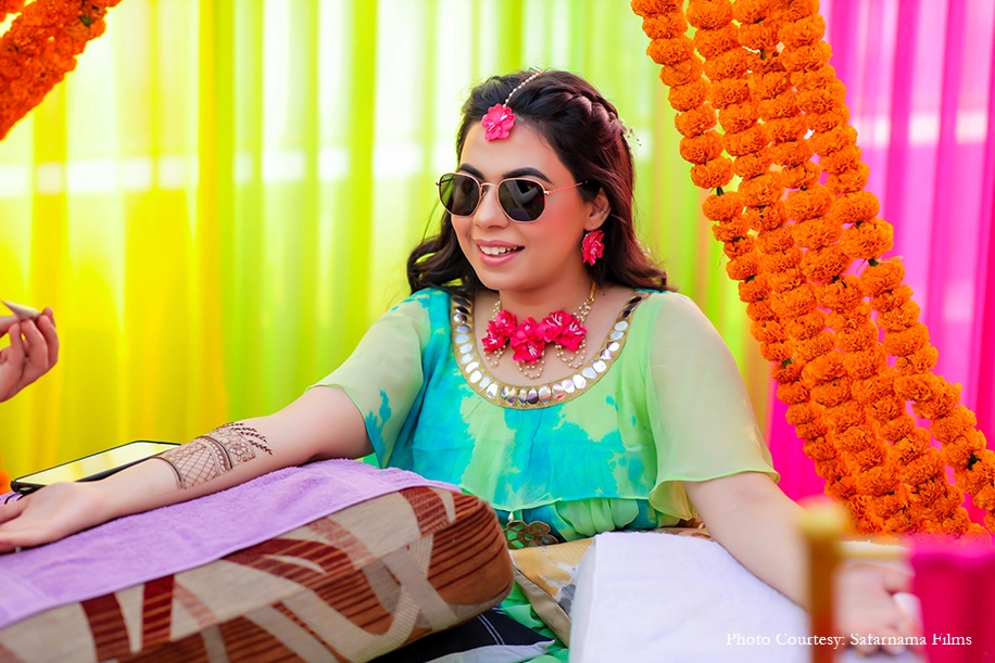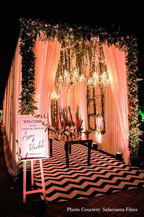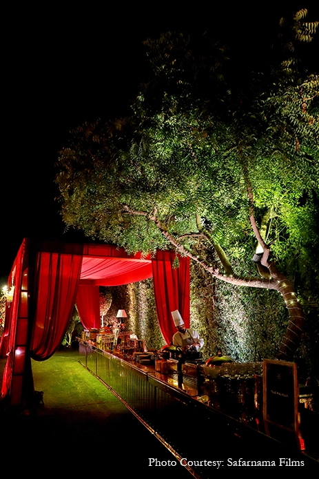 A vibrant decor consisting of drapes, tassels, umbrellas and marigolds livened up the venue. A fun ‘Theka’ themed bar ensured this Mehndi rocked the evening with its desi flavors. The couple and their guests had a gala time enjoying fun activities, music, cocktails and quirky giveaways.