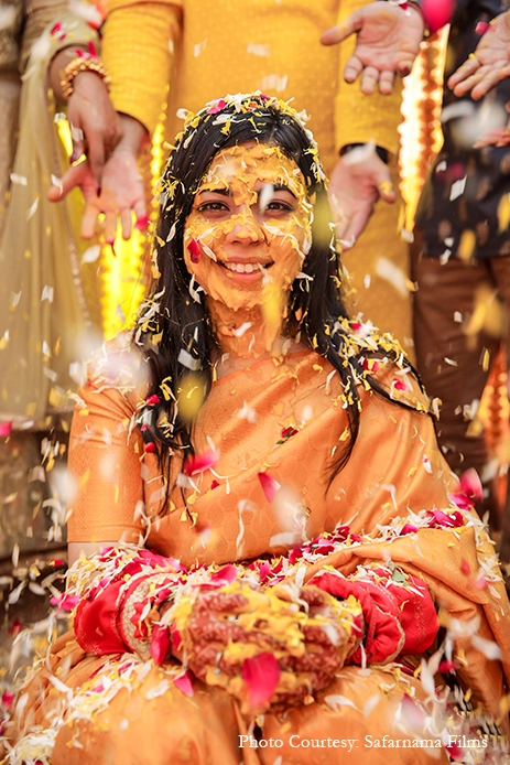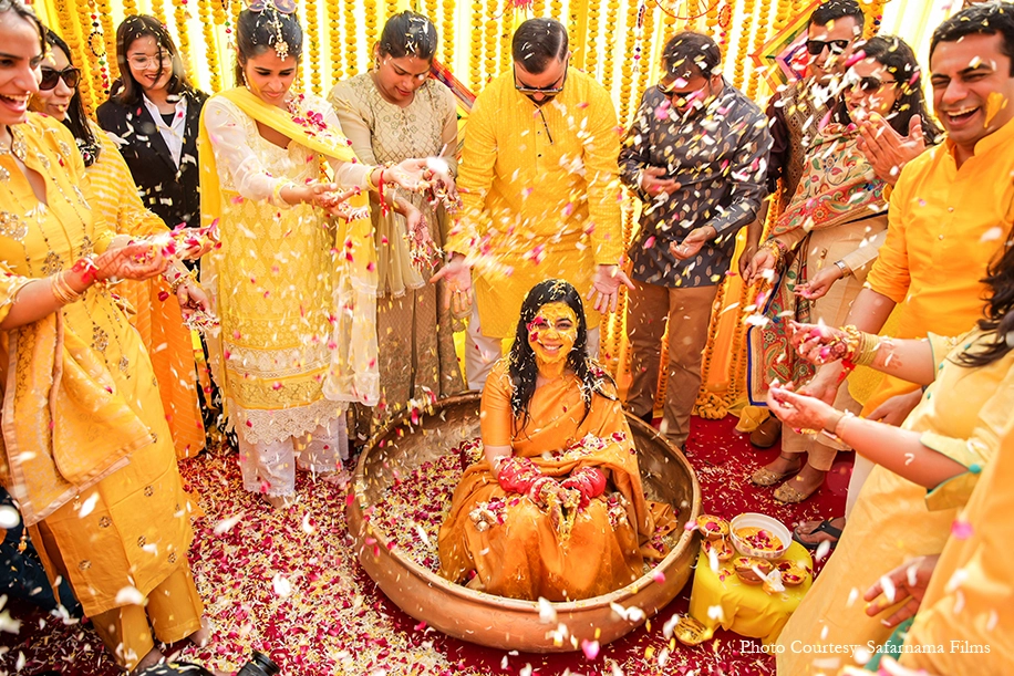 The wedding began with an intimate Haldi ritual. Bright decor of marigolds decked the occasion even as puffs of Holi colors filled the air. The couple were seated in traditional metal vats while being doused with turmeric and flower petals.