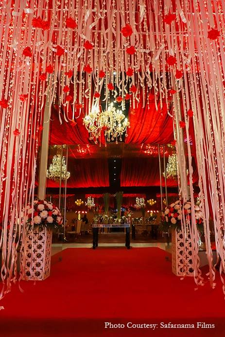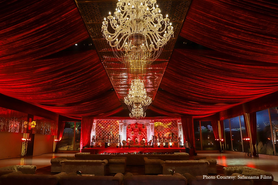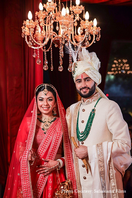The grand wedding ceremony saw quintessential hues of red, white and gold. The majestic decor came alive with plush drapes, chandeliers, floral canopies, diyas, traditional vessels and more. The couple looked resplendent in matching hues of white and red as they tied the knot amidst cheers and floral showers by their loved ones.