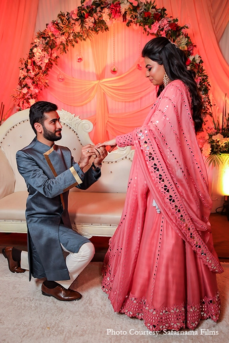 The Engagement ceremony or Sagan was a traditional, elegant affair with pastel decor of delicate florals, neutral hues and intimate revelries. The bride donned a pretty peach lehenga for the evening which was perfectly complemented by the groom’s striking grey and gold ensemble.