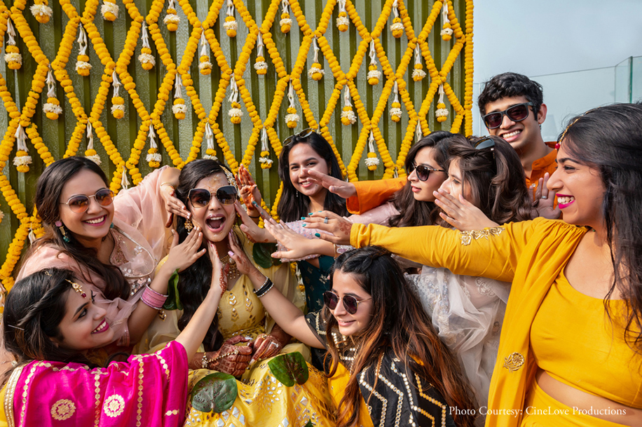 With its traditional yellow hues, the Haldi was a sunlit rooftop function where the bride and her friends had sweeping views of the city as they smeared each other with turmeric. Teeming with marigolds, the decor observed a floral theme and had plenty of comfy seating areas where the guests could enjoy the perfect New Delhi weather.
