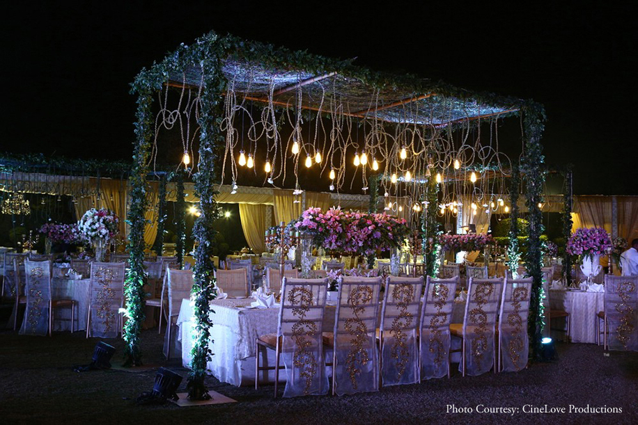 For their big day, the couple chose to go classic with an ivory, gold, and green color palette that suited the venue’s elegant architecture. Hosted on one of ITC Maurya’s lush lawns, the seating arrangements were breathtakingly alluring with their delicate blooms and glimmering lights.