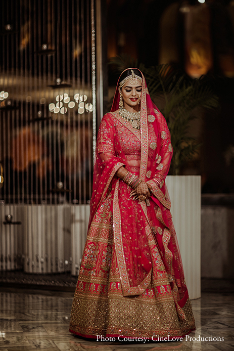 Contrasting beautifully with the decor was the radiant bride in her bright red lehenga with floral motifs that she accessorized with statement kundan jewelry.