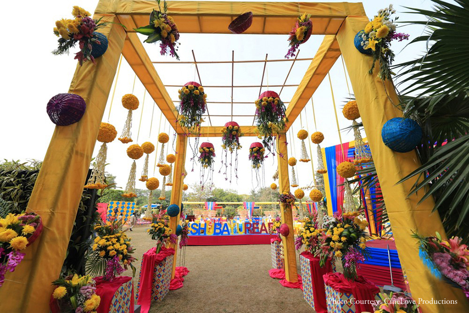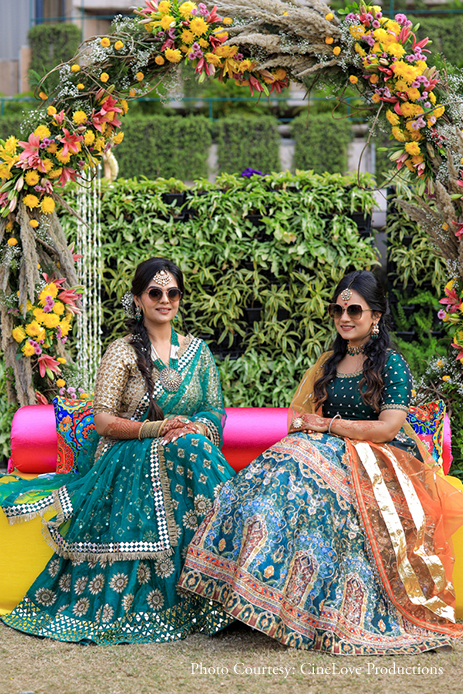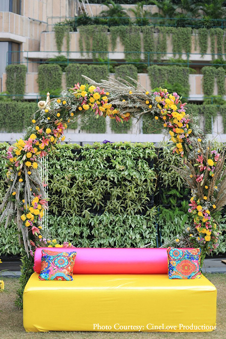 A day function, the Mehndi was full of cheer and sunshine as Ayushi and her girl squad gathered to get henna patterned on their hands. The decor color palette had a distinctly feminine theme with yellow, fuchsia and turquoise hues striking a captivating contrast with the green lawns.
