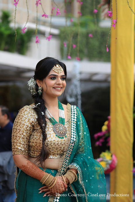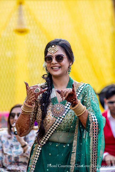 Keeping the blazing sun in mind, Ayushi chose to slip on her sunglasses and opted for a classic green and gold lehenga. For accessories, she chose a pearl and emerald necklace that matched her outfit.