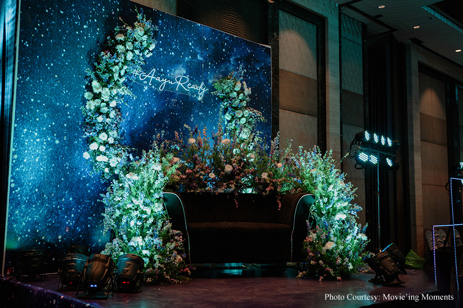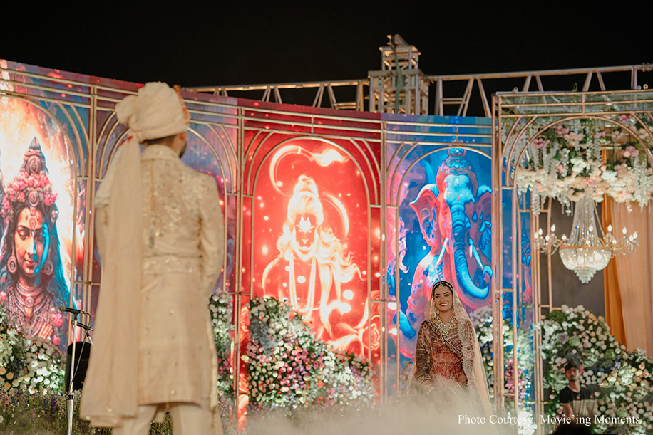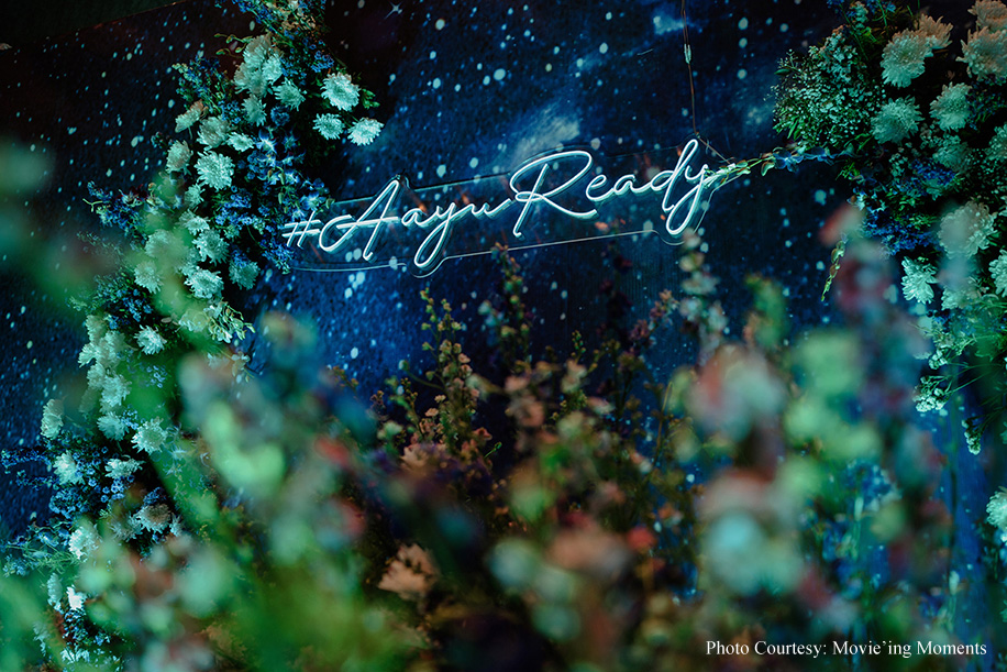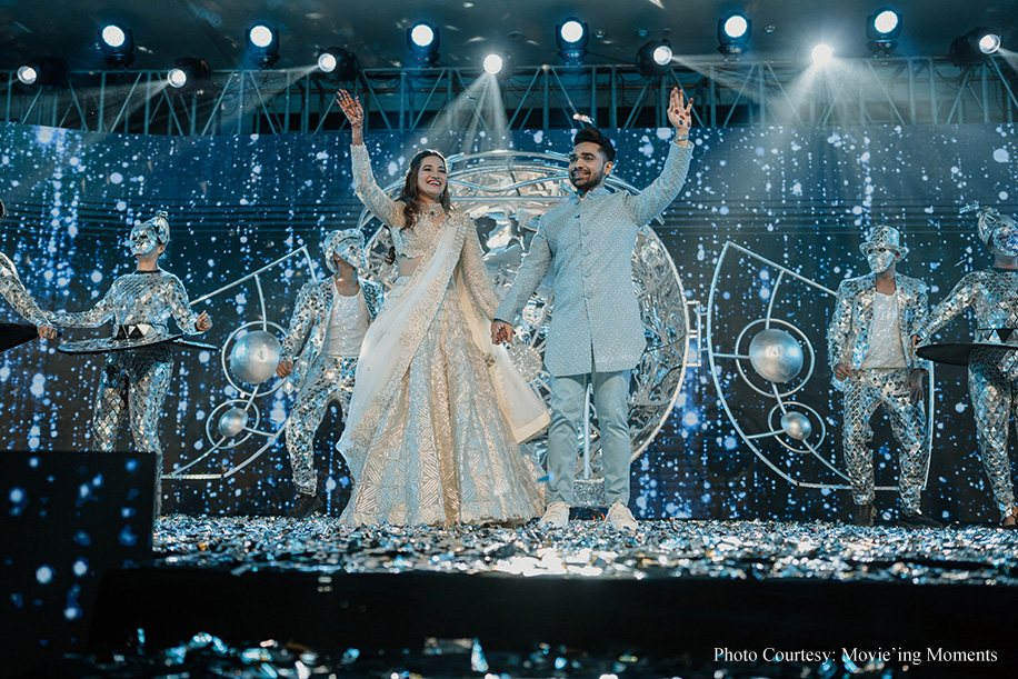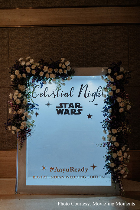 For Ayushi and Ayush, the sangeet was one of the most awaited events of their wedding. Harsh shares, “A 360-degree LED screen pathway, a starry photo booth and massive cake ensured the Star Wars-themed celestial sangeet looked straight out of the movies with its grandiose setup. The ring exchange and cake-cutting were followed by heartfelt speeches by their siblings, cousins and the whole family. Plus, the emcees set a light heart atmosphere for the evening as the families settled in for a night of stunning performances and witty interactions.”