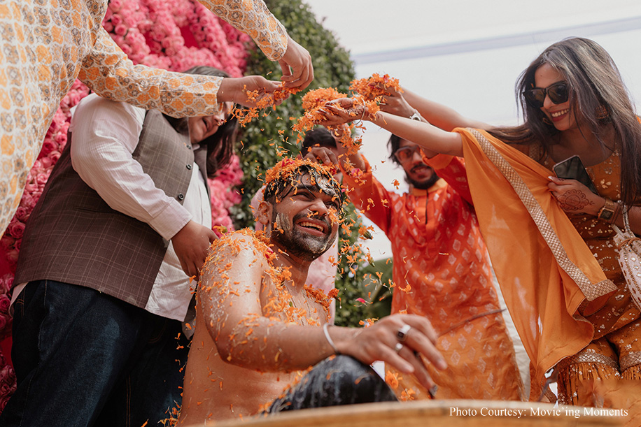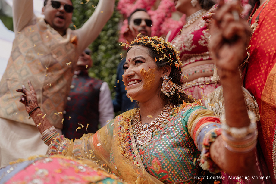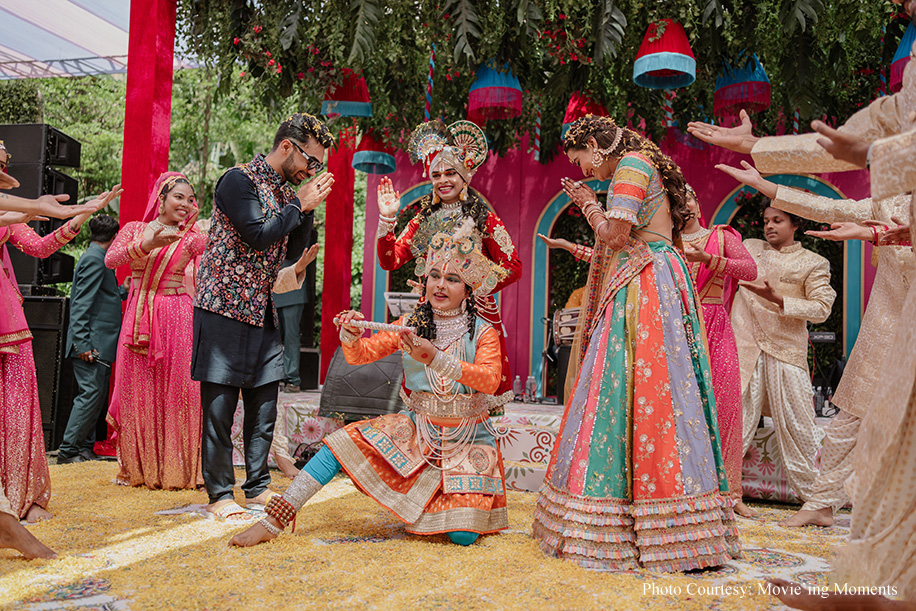The second day of the festivities kicked off with a Ras Leela-themed haldi where the decor took a cue from the beauty of Vrindavan. Ashique shares, “Uses of elements like peacock feathers, colourful flowers, and traditional Indian fabrics were used to decorate the venue, hosting the auspicious haldi. The couple’s entry was done with dancers dressed as Radha and Krishna with a beautiful palki. This event had some fun anchor-based activities and performances that were followed by ‘matki fod’ ceremony and a floral holi.”