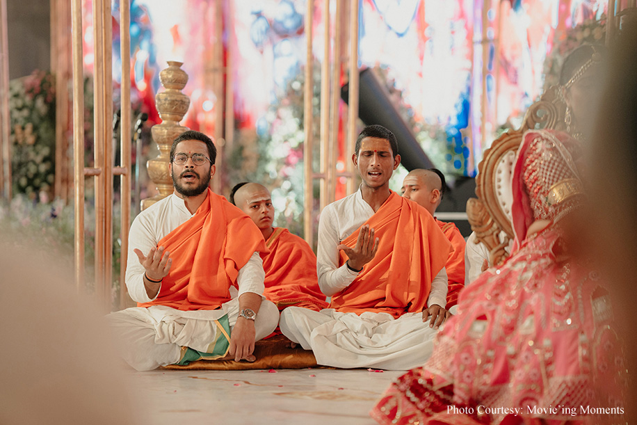Our mandap had a beautiful backdrop adorned with the deities cherished by the entire family. It provided a stunning frame for the varmala ceremony, symbolizing the union under the blessings of their beloved gods. We also had over 15 pandits working in harmony to conduct the rituals, adding a touch of royal elegance to the entire affair. Through this thoughtful orchestration, we ensured that every element of the wedding carried a sense of grandeur, love, and devotion.”