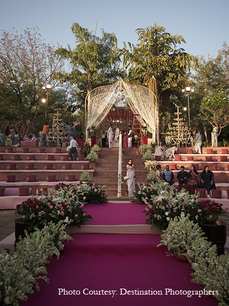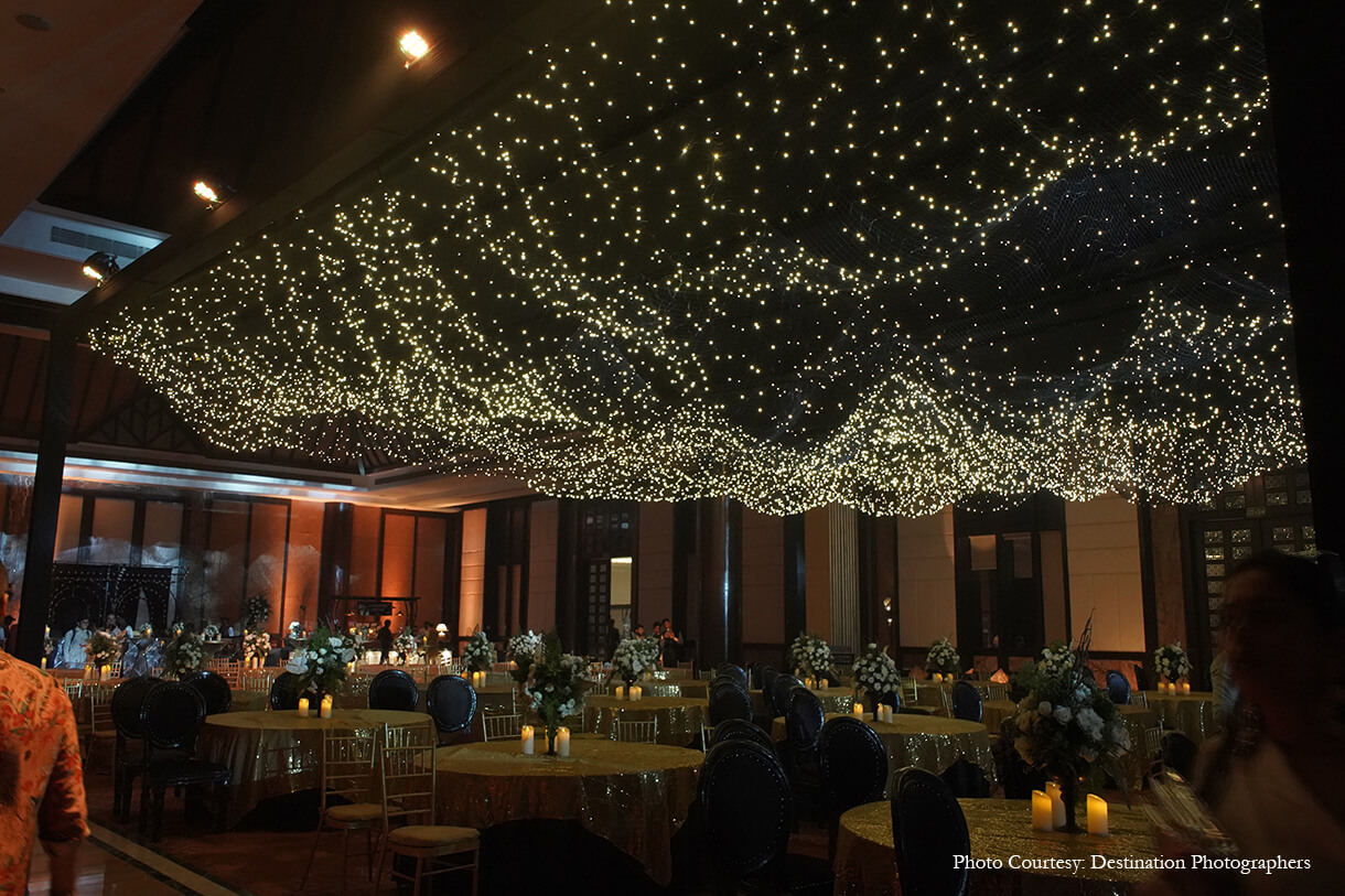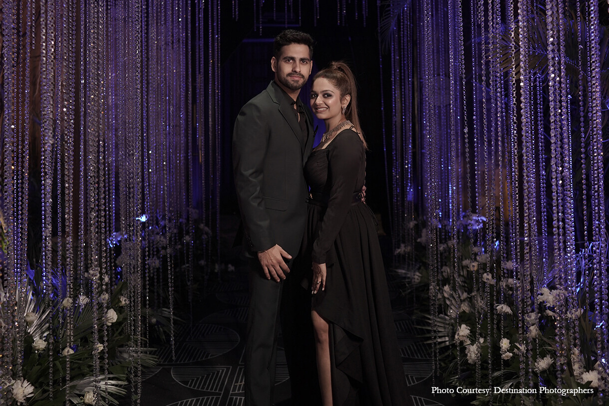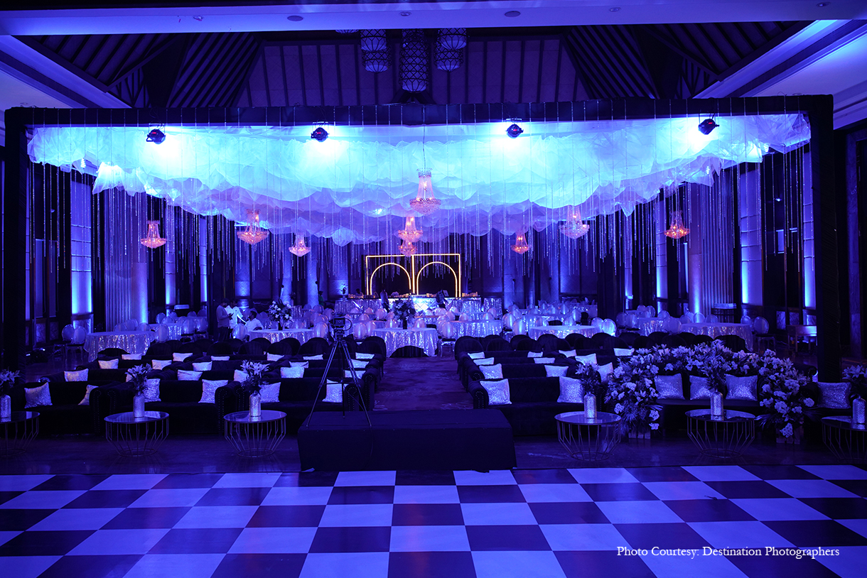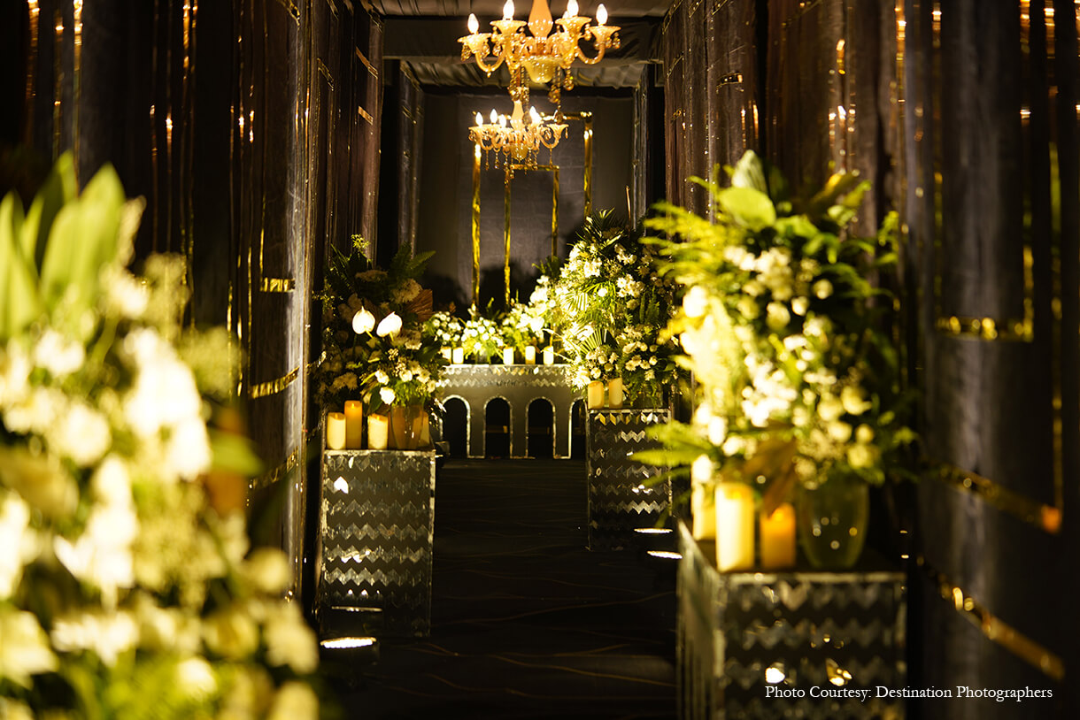 The Sangeet night was a glamorous occasion with a decor palette of glittery silver, golden, and black. The entrance was decked up with foliage, chandeliers, and Arabic lights for a mysterious enchanted forest feel that flowed onto the passage with silver walls and white floral arrangements. A fairy cloud canopy with fishnet and rice lights, disco balls, modish prints, and more, added to the magical aura of the occasion. After a dazzling entry amidst loud whistles and cheers, the couple had a gala time witnessing the performances put up by their friends and family, while the All India Permit Band had the guests grooving to their beats all evening. DJ Omen finally took over the night, keeping guests on their feet till morning.
