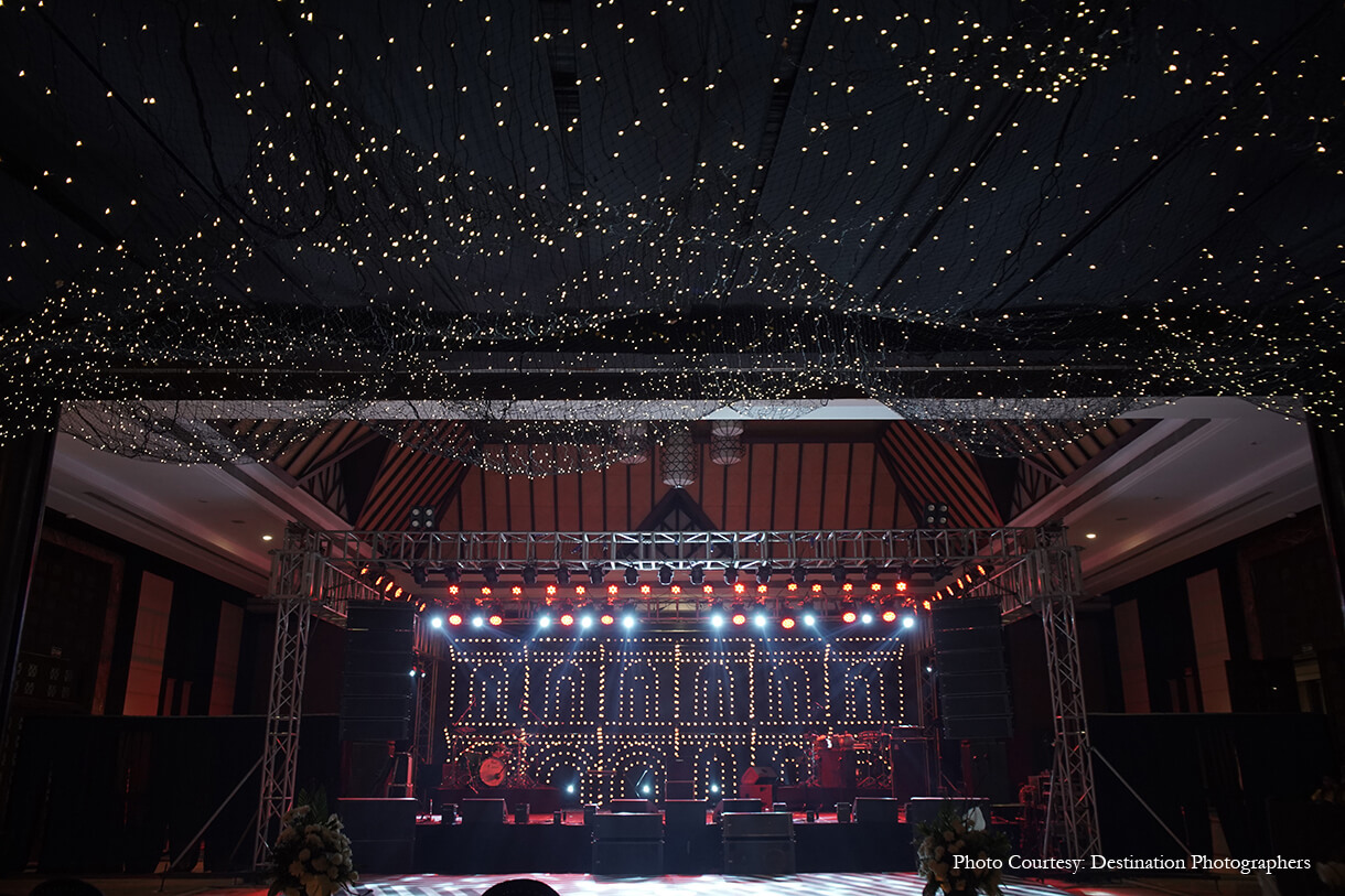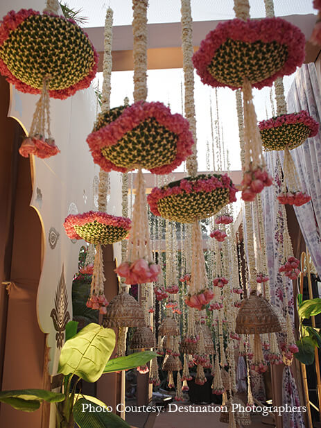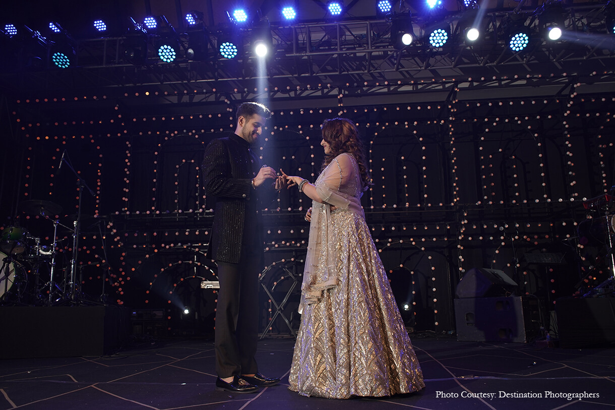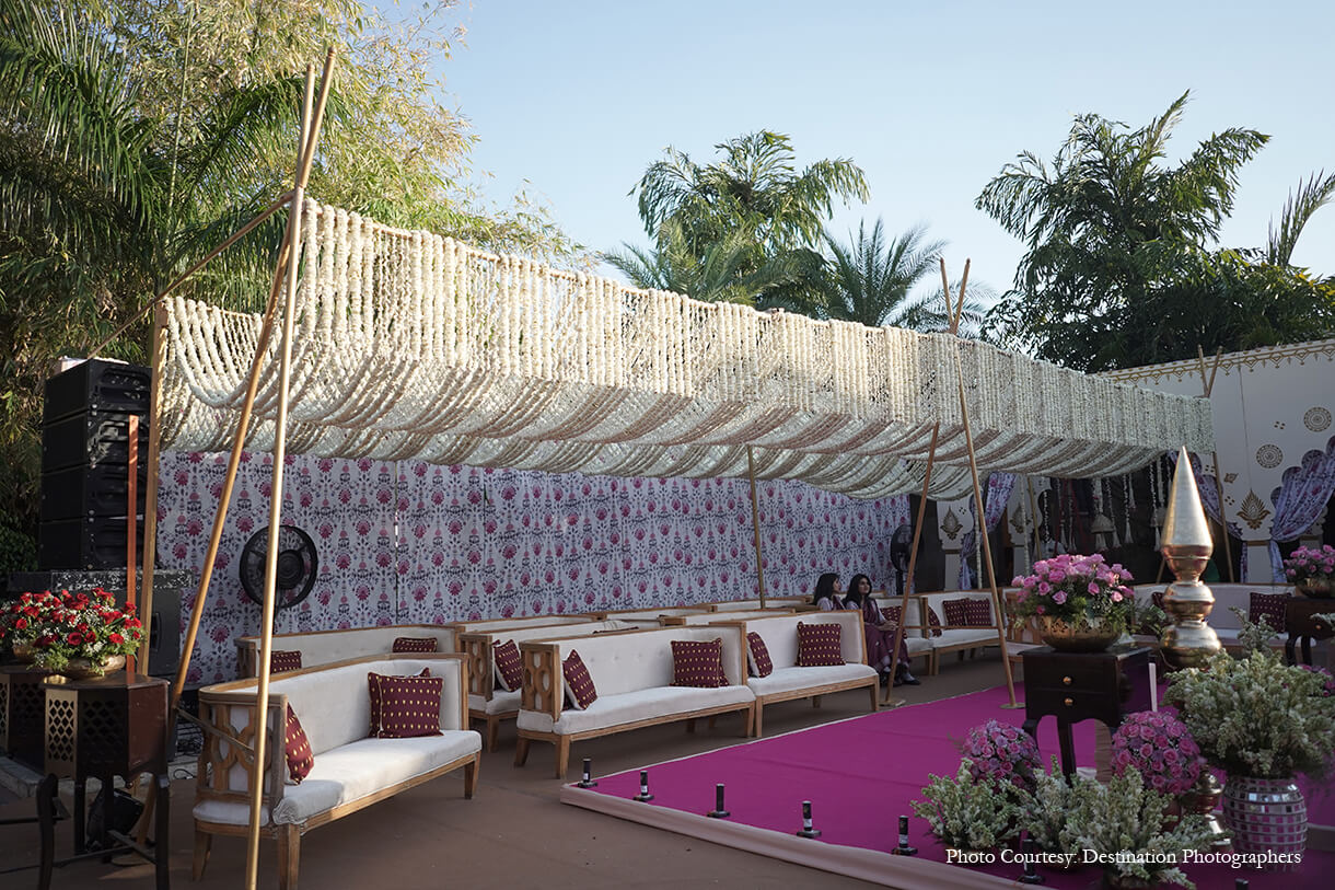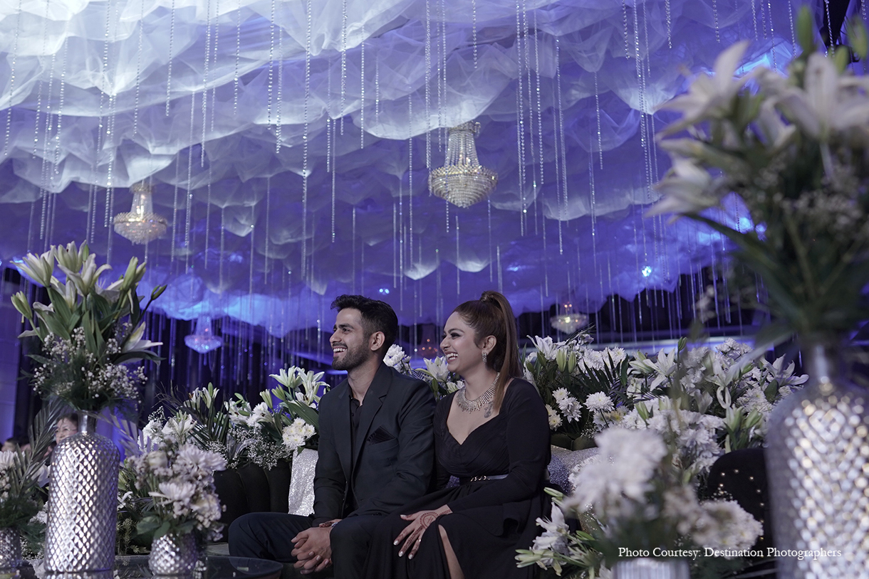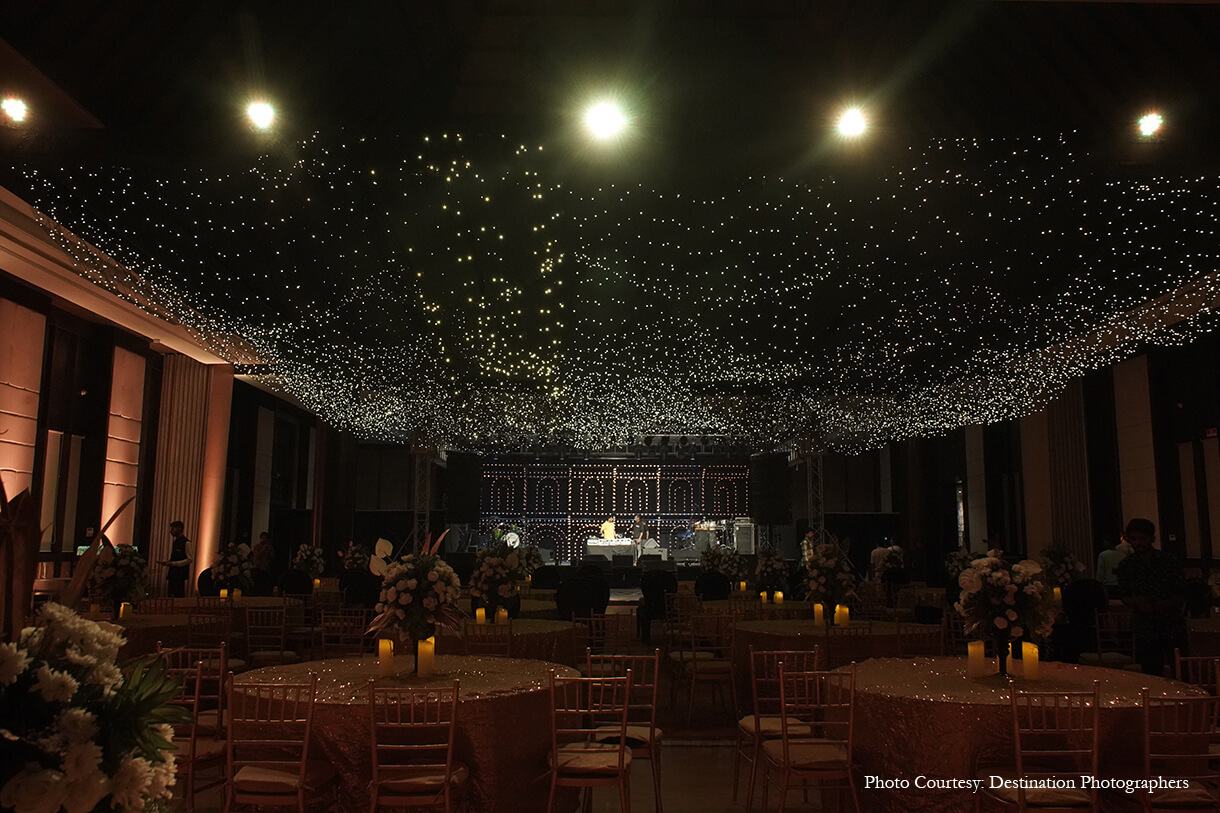 The Sangeet night was a glamorous occasion with a decor palette of glittery silver, golden, and black. The entrance was decked up with foliage, chandeliers, and Arabic lights for a mysterious enchanted forest feel that flowed onto the passage with silver walls and white floral arrangements. A fairy cloud canopy with fishnet and rice lights, disco balls, modish prints, and more, added to the magical aura of the occasion. After a dazzling entry amidst loud whistles and cheers, the couple had a gala time witnessing the performances put up by their friends and family, while the All India Permit Band had the guests grooving to their beats all evening. DJ Omen finally took over the night, keeping guests on their feet till morning.