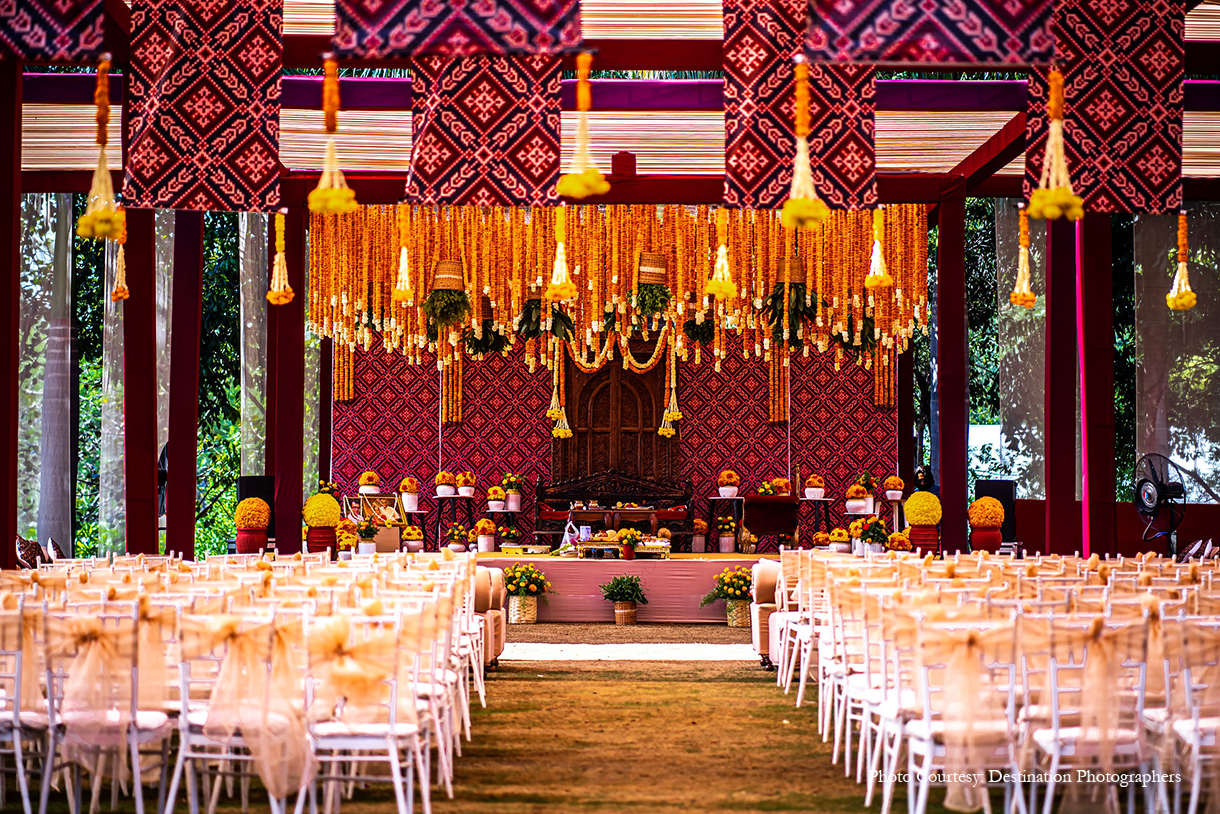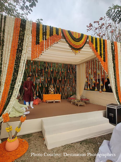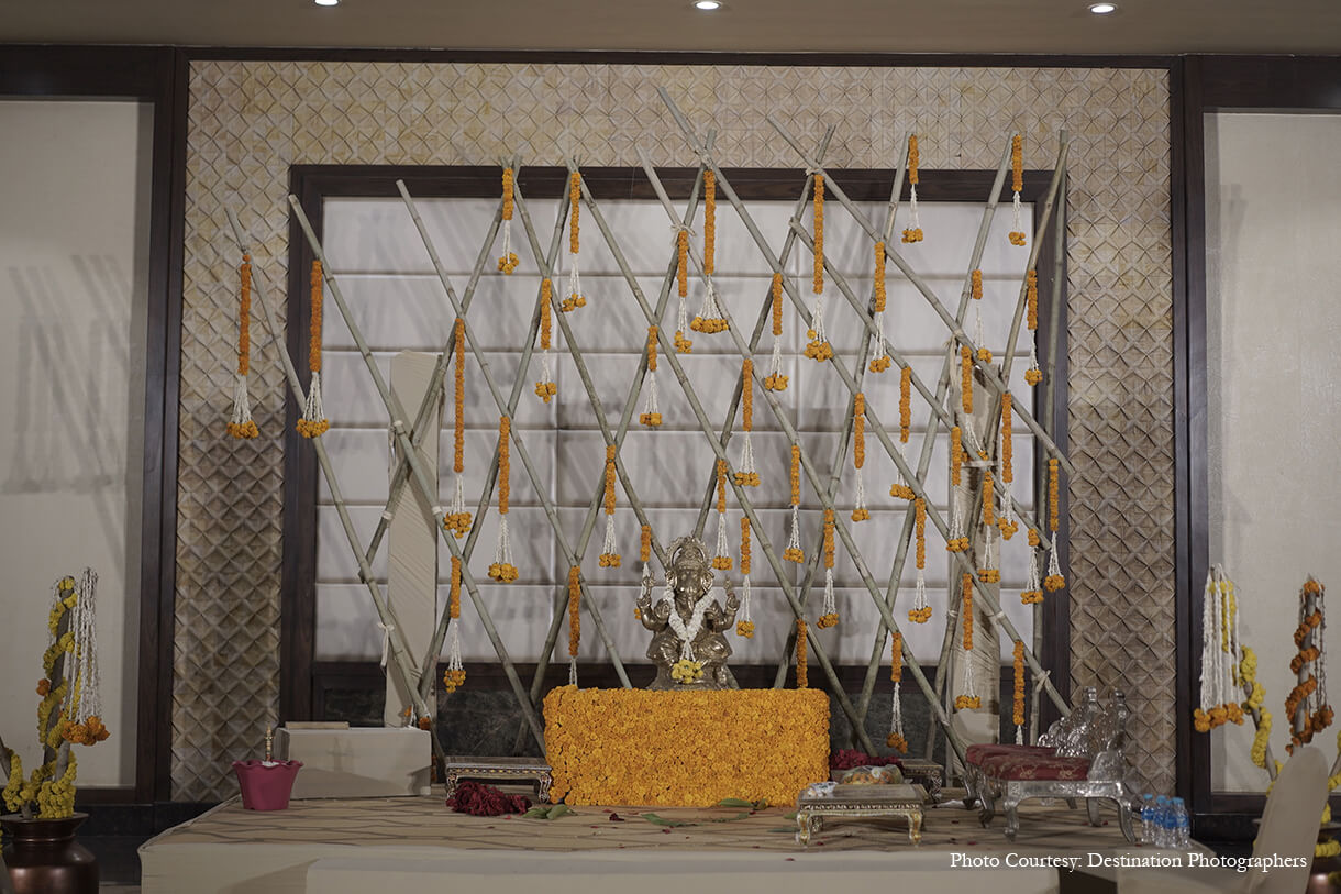 To mark the commencement of the wedding rituals, a Ganesh Pooja was organized in keeping with the couple’s traditions, imagined with simple, yet stunning decor. Shifted indoors at the last minute due to the rains, the occasion saw serene moments of tradition as they took blessings from Lord Ganesha.