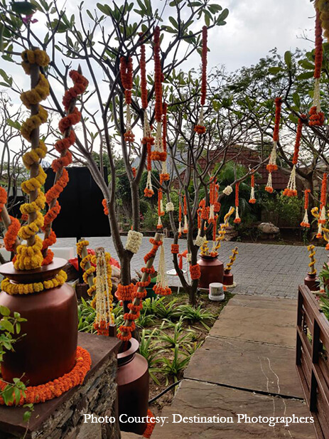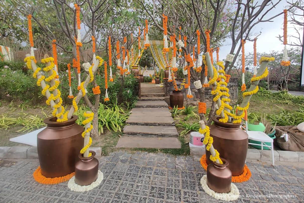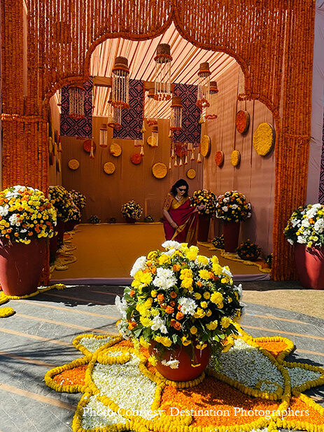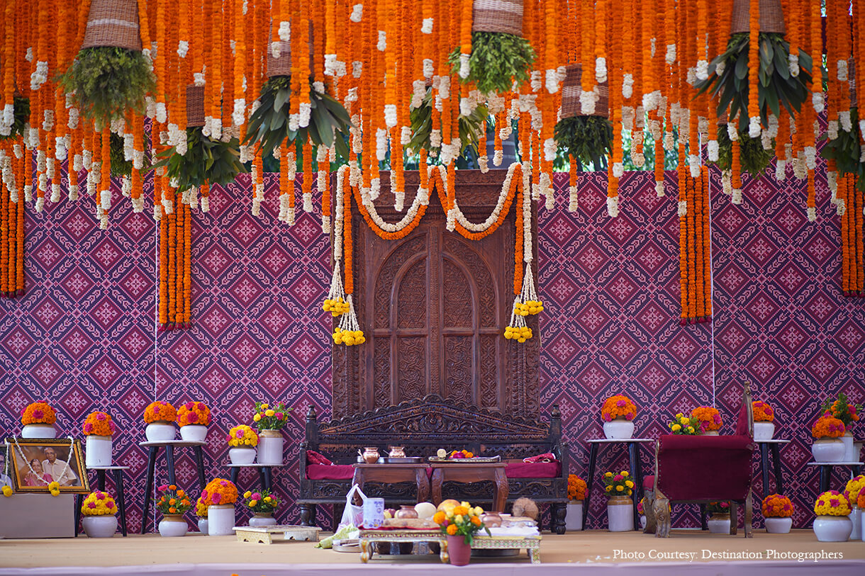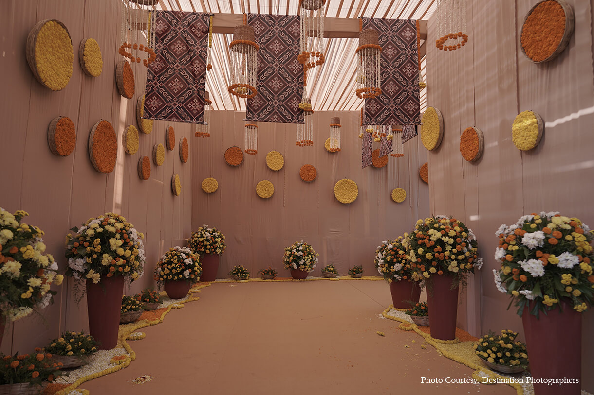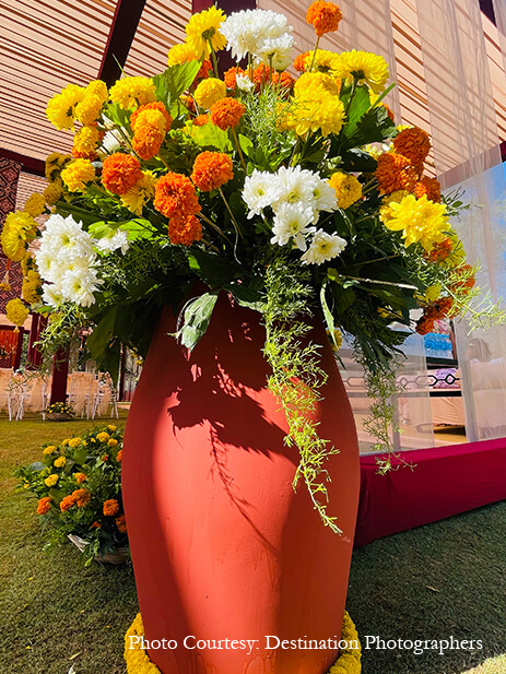 Gran Shanti pooja was a vibrant, traditional affair in white, orange, yellow, and green hues. A flower rangoli welcomed the guests, while a passageway of yellow and orange floral arrangements with inverted hanging wicker baskets led to the function. The space was lit up abundantly with marigolds in creative arrangements, while patola drapes added another stunning traditional element to the decor. The symphony of shlokas and chants filled the air with a spiritual ambiance.