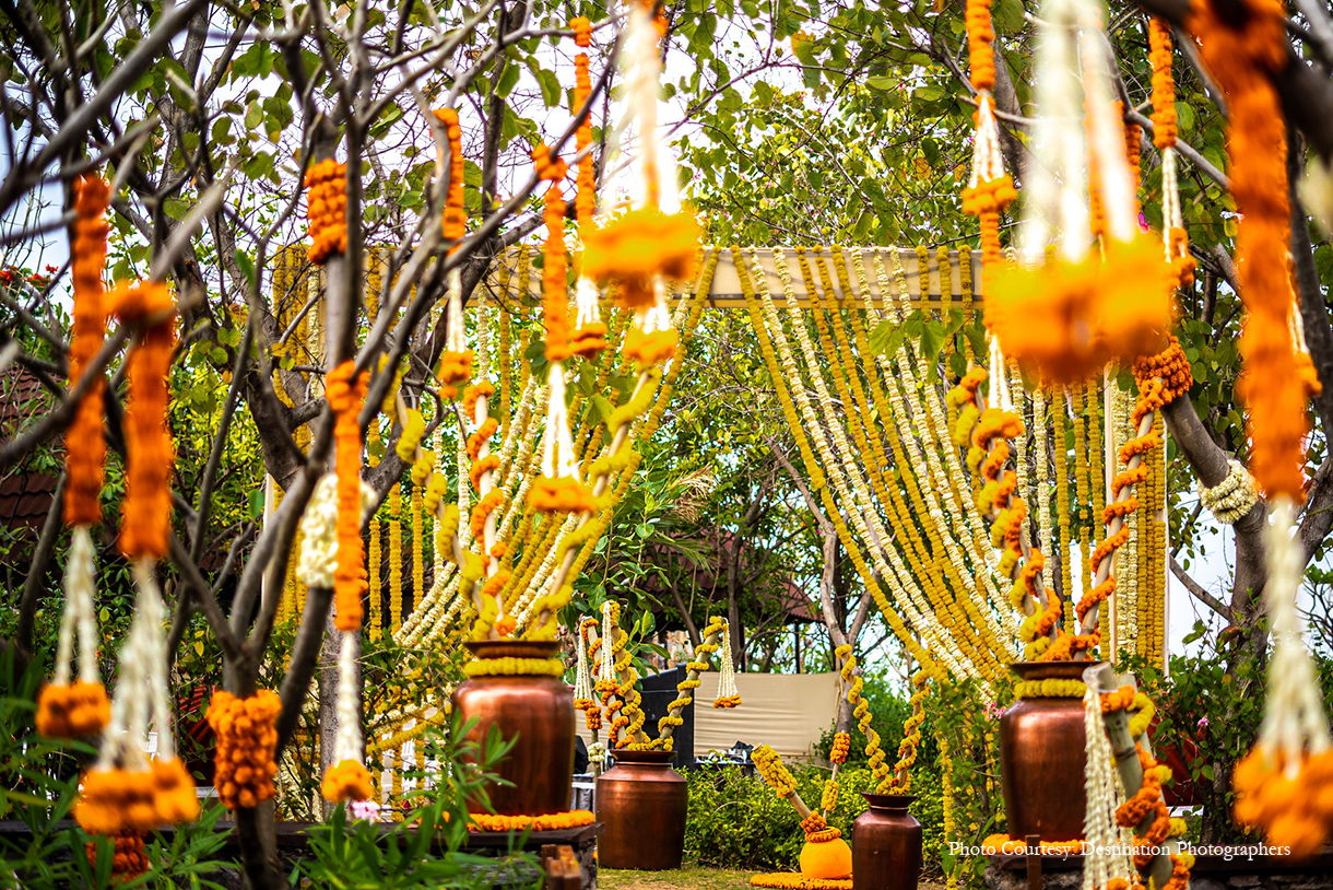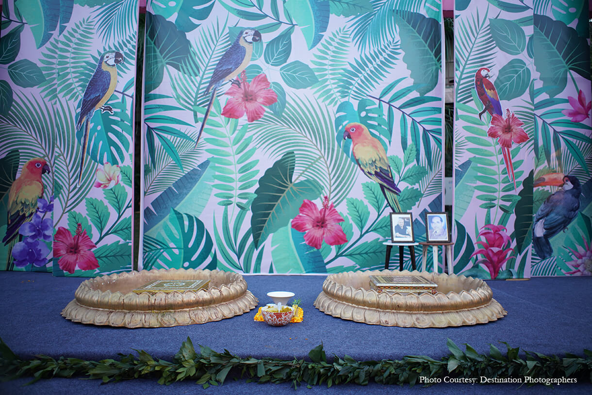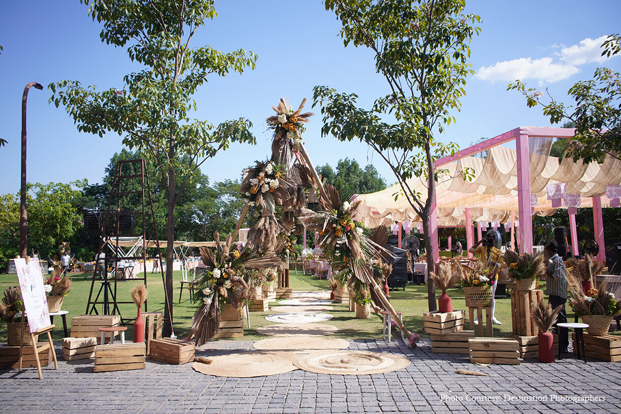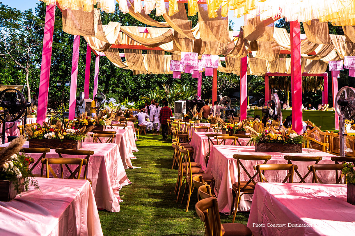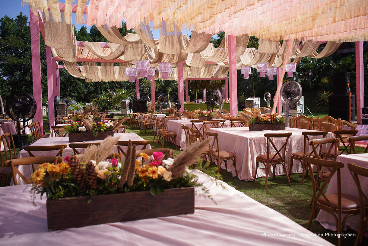 With sunny skies and breezy weather, the Haldi and Mehndi soiree saw an upbeat afternoon of fun-filled festivities. Drapes in soft hues created a serene palette that was filled in with bohemian and tropical decor elements. Pampas grass, flowers, and greens added to the natural and organic feel of the occasion. Disintegrated image panels made for a unique and visually striking backdrop for the stage as friends and family spent the afternoon with music, dance, and non-stop enjoyment.