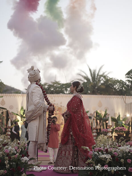 The groom entered in style in a vintage car along with all his baraat dancing on the beats of Dhol and DJ Van. As a thoughtful gesture, shawls were given to the guests to keep them warm during the Baraat welcome. The varmala stage exuded romance with delicate floral arrangements where the couple exchanged garlands amidst an explosion of joy and colors as rose petals showered down on them.