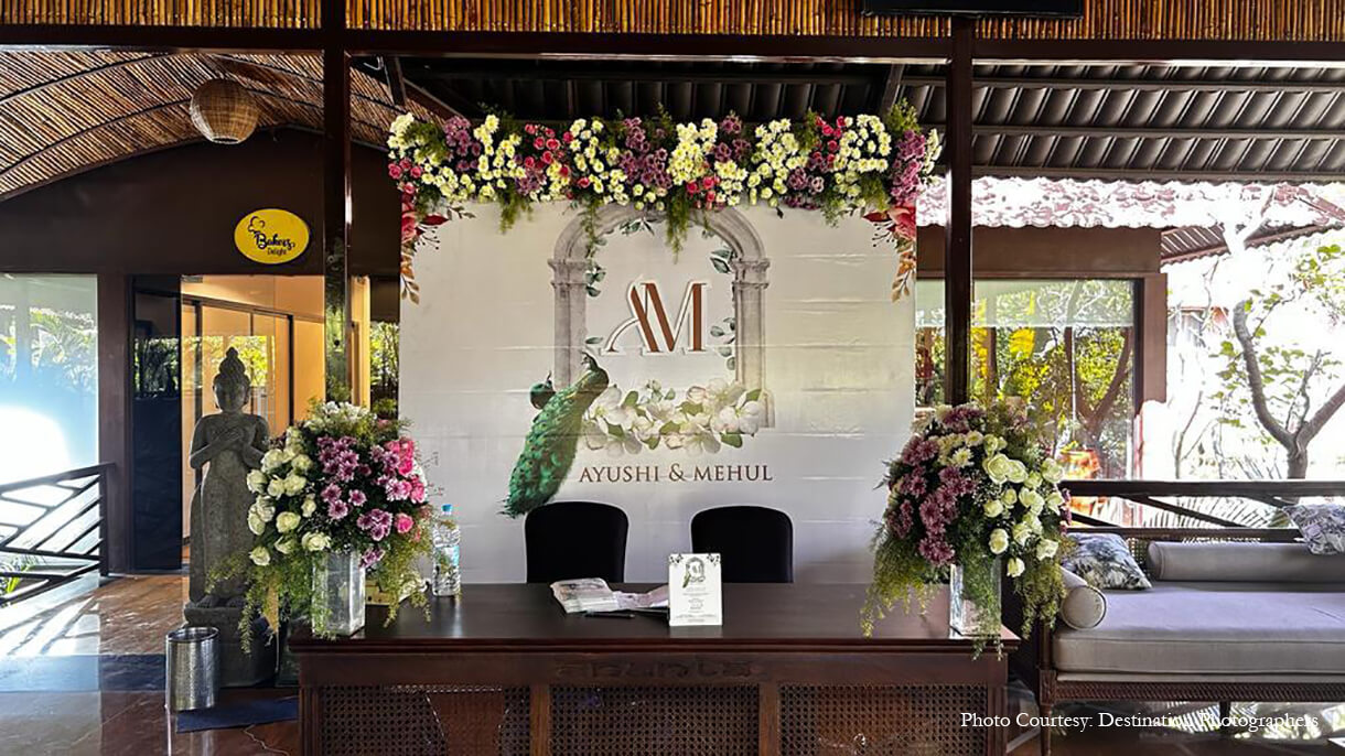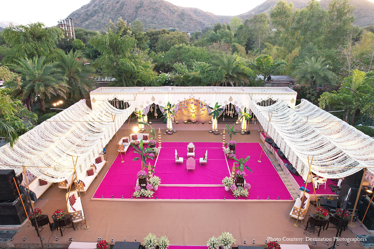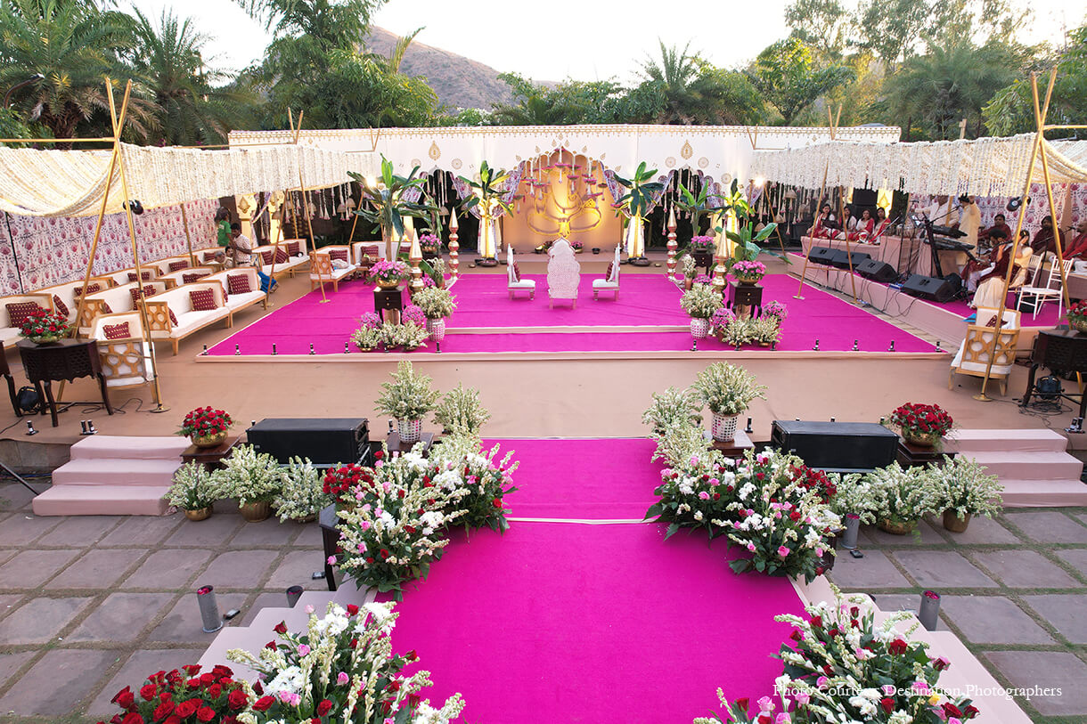 The wedding was a traditional affair with a modern touch. The venue was beautifully decorated in pink and white hues with chandeliers, with the natural beauty of the space perfectly complementing the mandap. A floral Ganesh idol served as the backdrop for the rituals. The family sat on either side of the mandap under a canopy of scalloped rajnigandha garlands. A specially designed book with wedding mantras was distributed among the guests during the ceremony to explain the importance and meaning of various rituals, while serene wedding chants by Mangal Pheras added to the sanctity of the occasion.