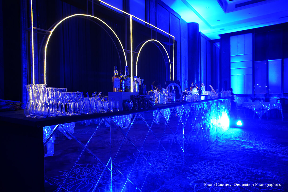 The Reception dinner was a grand affair with intricately curated elements. Upon entering, the guests were greeted by a mesmerizing LED light passage that added a chic, edgy touch, while the periphery walls were adorned with LED strips that added a sense of magic to the occasion. A cloud mesh ceiling with glistening crystal droplets and chandeliers created the illusion of a floating canopy overhead. As the evening progressed, the atmosphere became even more celebratory with the stunning champagne tower and heartfelt speeches by the couple and their close ones.