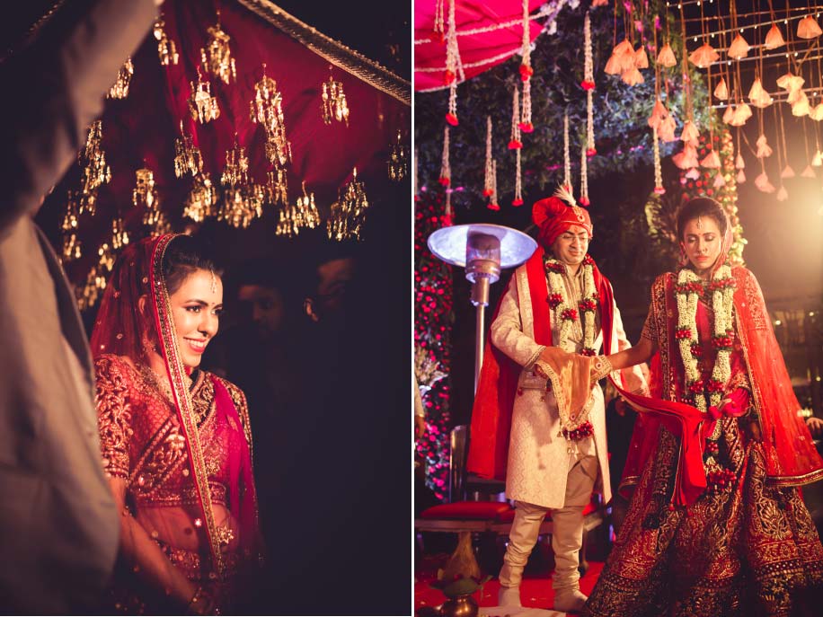 The bride looked gorgeous in a red embroidered lehenga by designer Tarun Tahiliani. For the varmala the bride walked in escorted by her brothers who carried a red dupatta adorned with gold kaliras. The passage to the mandap was lined with long gota ribbons which shimmered in the light as the bride walked in, adding an ethereal charm to the moment. Rose petals were showered on the couple as they exchanged garlands. Mantras were chanted by a group of shank pandits as the bride walked in towards the mandap for the pheras.