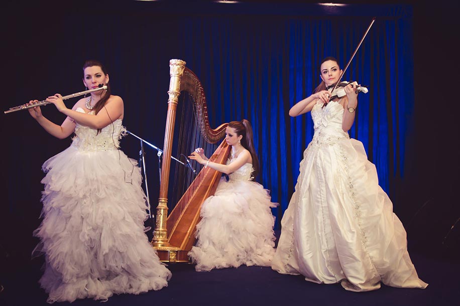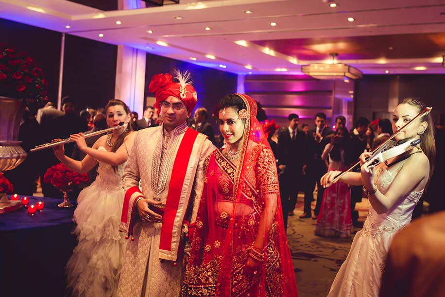 The reception shifted indoors to the banquet hall. The color palette chosen was a deep red and peacock blue, which made the entire place look regal. The stage backdrop consisted of white and red roses. An international trio of harpist, flutist and violinist played popular Bollywood instrumental music and welcomed guests as they arrived for the reception. Apart from the delicious food, the guests enjoyed the couplets by the capital’s famous ‘Shayari Paanwala’.