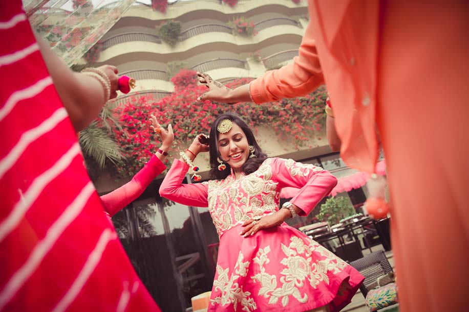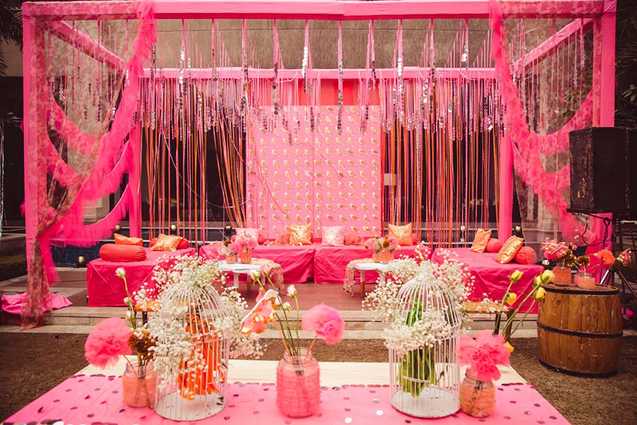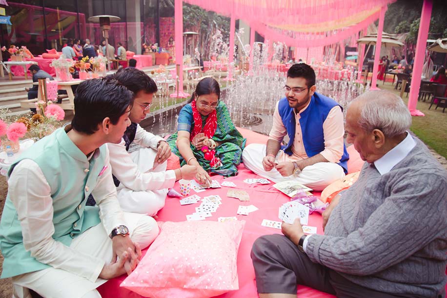Live stations serving finger foods and tantalising chaat counters added to the whole “mela” vibe of the event. Gota jewellery, pom pom rings and Bandhini dupattas were given to the ladies as gifts. Keeping in sync with the funky and kitsch theme, the bride had her friends blowing bubbles as she walked in. She wore a pink embroidered peplum top with beige dhoti pants by Delhi-based designer Sonali Gupta for the event.
