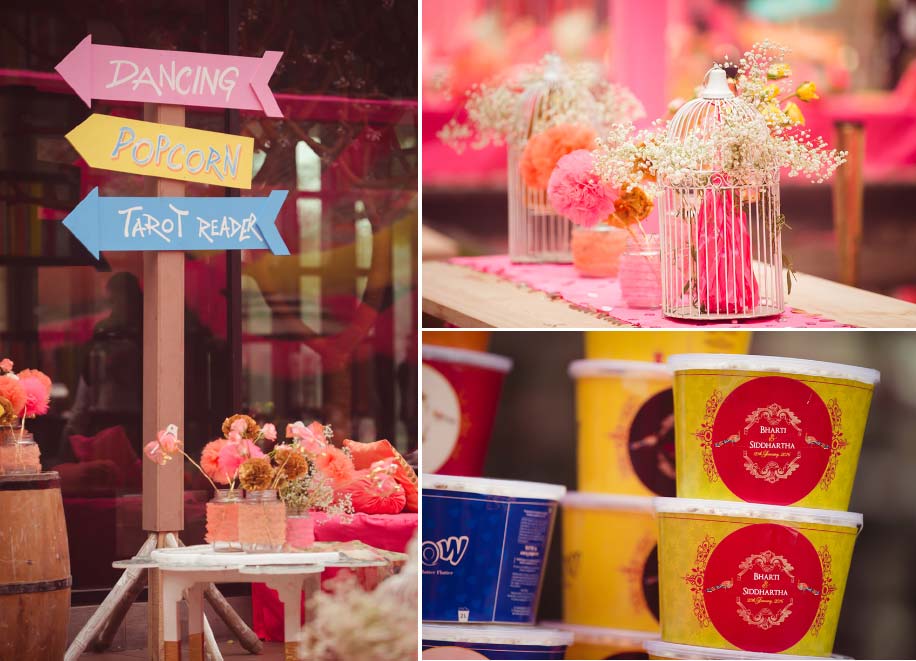 The following day, the bride’s family hosted a Mehndi only attended by her side, which was something new and non-traditional while still keeping a bit of the ‘Kitsch Indian-ness’ to it. Rani Pink – a New Delhi based decor company did an outstanding job. The outdoor garden area was decked up with colorful fabric buntings and floral pastel fabrics forming the roof of the tents. Rustic wooden picnic tables displayed frilled mason jars and birdcages filled with ribbon tassels, fabric candyfloss flowers and real blooms. The bridal seating area was decorated with a kitsch parrot backdrop and colorful ribbons with mirrors hanging from the top. The mehndi artists, tarot readers and live Punjabi singers kept the guests entertained as they feasted on candy floss and flavored popcorn served in personalised tubs.