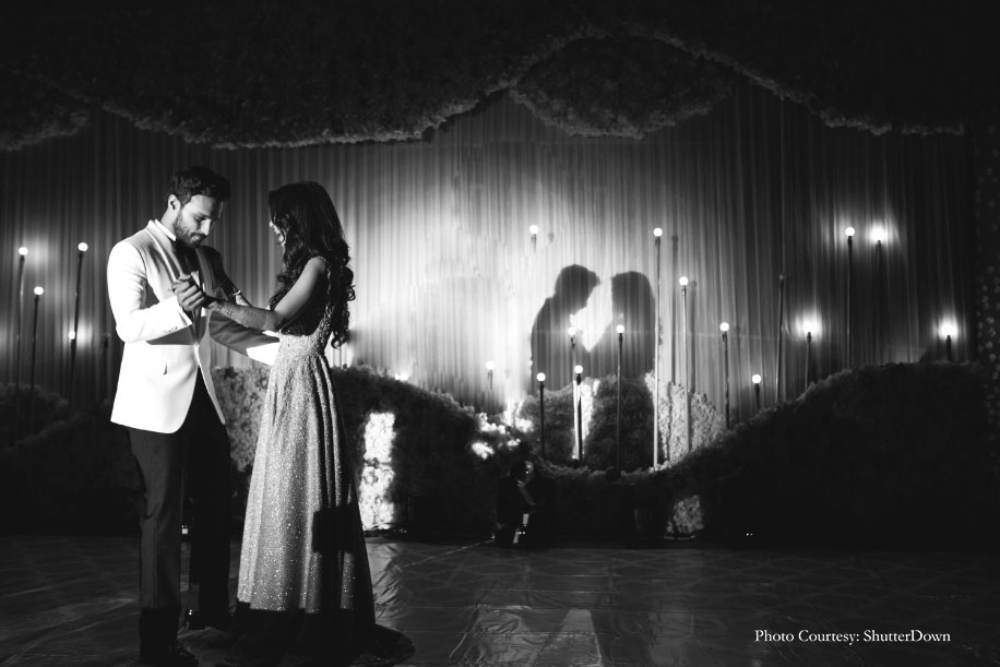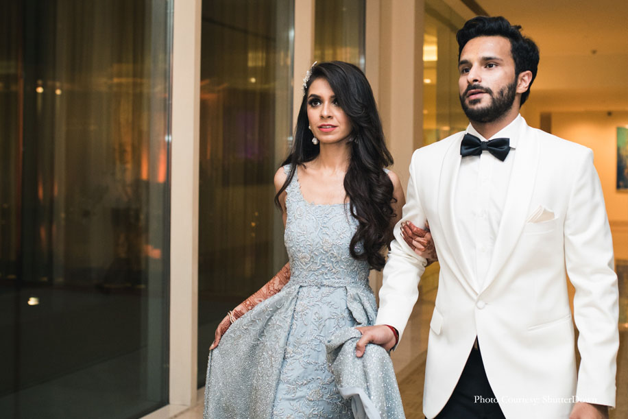 A grey gown by Kosech by Kresha Bajaj with the logo and date of their wedding embroidered in the back was Bhavi’s outfit choice for the evening while Ranjay looked dapper in a black and white tuxedo.