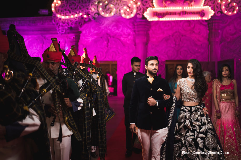 The reception took place at Kingdom of Dreams and was a picture of opulence and grandeur. Bhavi and Ranjay entered with the Indian army band playing by their side. The bride looked resplendent in a navy and gold lehenga by Manish Malhotra while the groom was dapper in a navy jacket and beige Jodhpur pants.