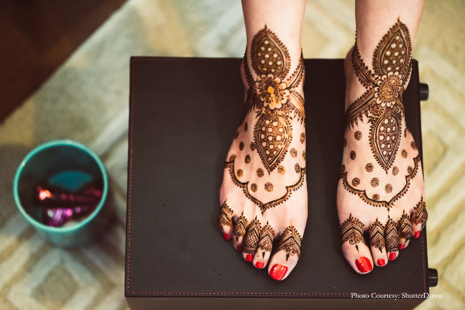 Bhavi wore a pink lehenga from Koesch by Kresha Bajaj while the groom went with a black kurta and red bandi jacket.The bride’s mehndi was designed by Alankritaa By Rashi who incorporated her logo with yachts on either side into the pattern.
