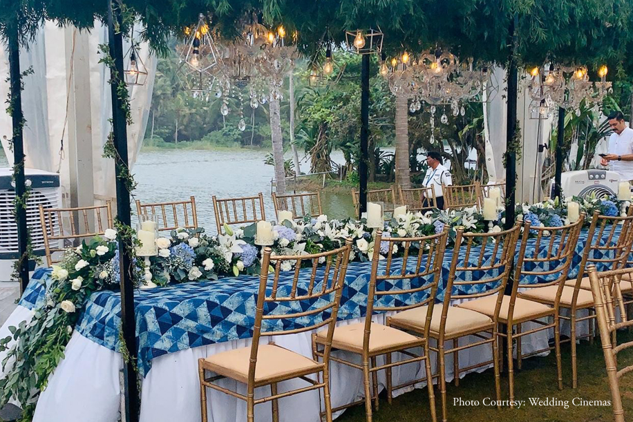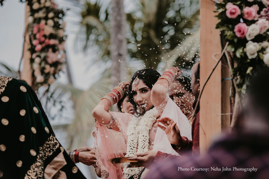 Luckily, the weather cleared up, and it soon became bright and sunny. The couple had quick ceremonies and pheras by the beach. Post the rituals, guests enjoyed a delicious sadya lunch on banana leaves, with thirty delectable Keralite dishes to feast on.