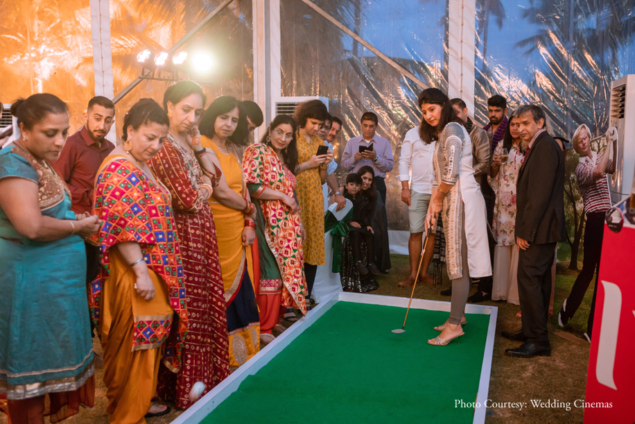 Gaurav had a separate Punjabi-themed party for his guests. He loves playing golf and got a bespoke golf field made for the venue, which was shipped specially from Bangalore. It included life-size cutouts of golf players, golf balls as centrepieces and golf lights hanging above the dance floor, making the event very personal.