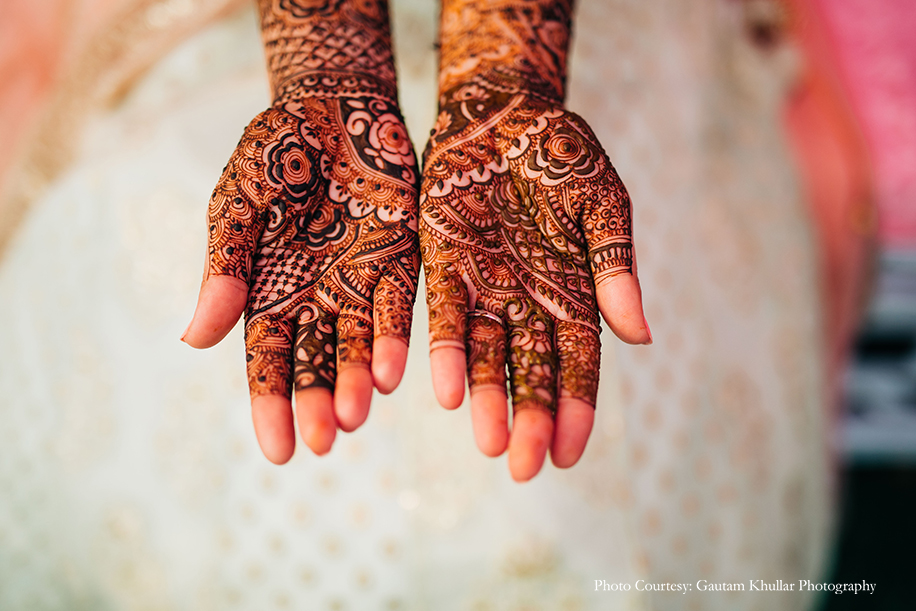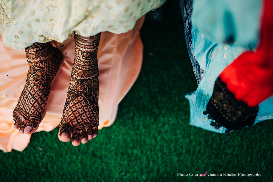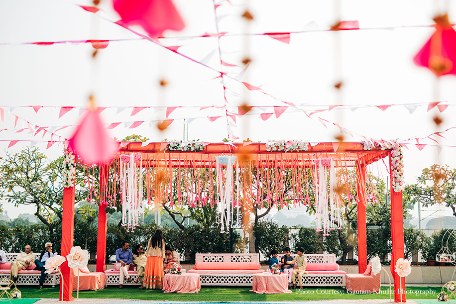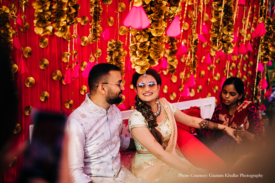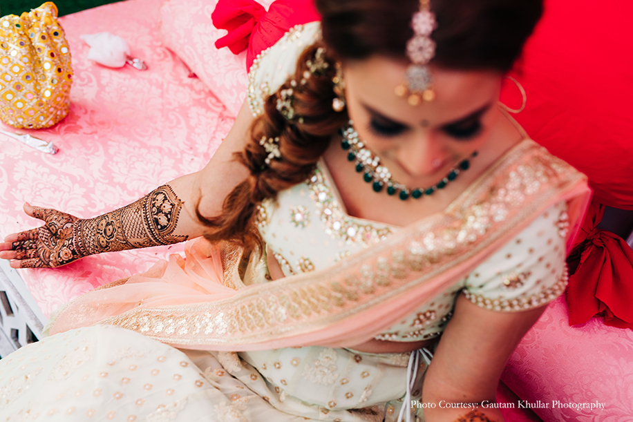 The mehndi was a traditional and breezy affair with Charu making happy memories with her buddies as she got henna patterns done on her hands. The decor followed a kite theme, with bold red colors serving as a backdrop. The bride looked radiant in a soft coral lehenga as she basked in the sunshine with a pair of sunglasses. Adding a pop of color to her outfit was an emerald drop necklace, dangling earrings, and hairpins on her side-swept braid. With the beats of the drums, Charu and her loved ones had a great time dancing to their heart’s content.
