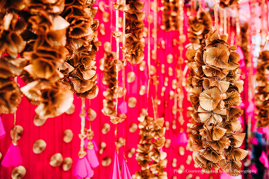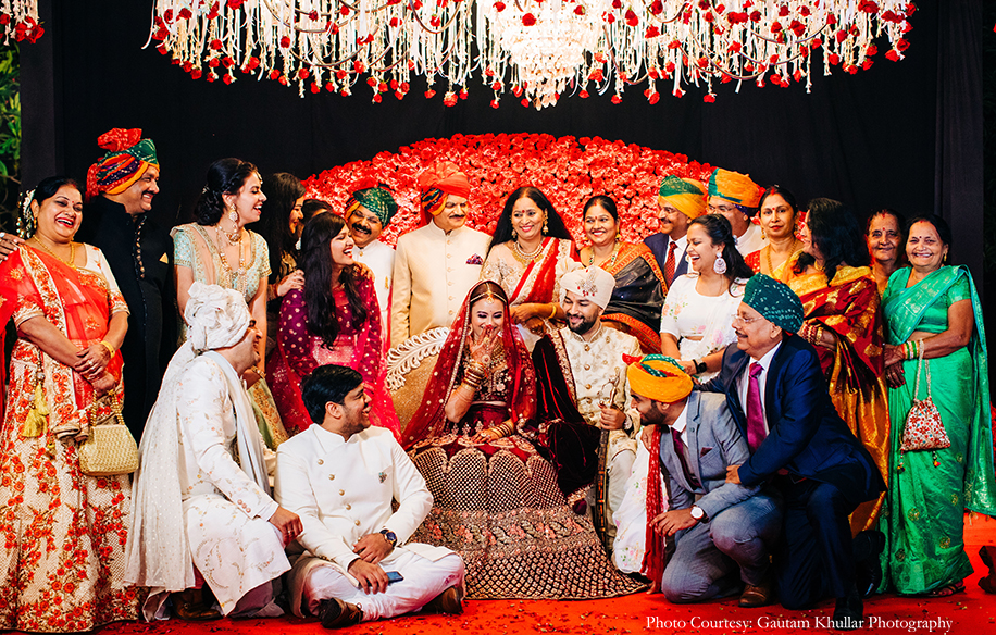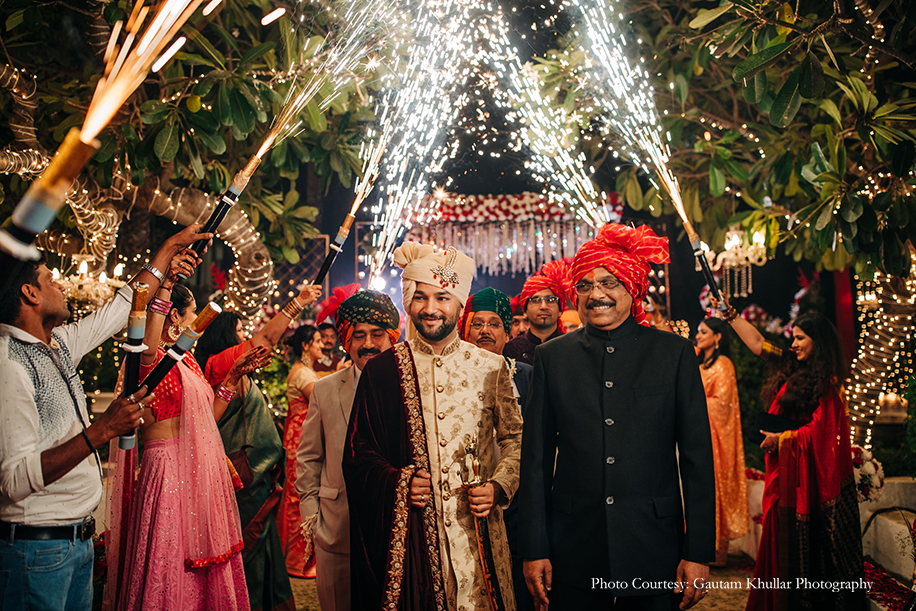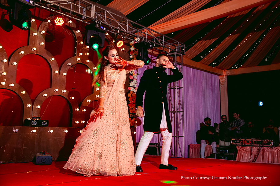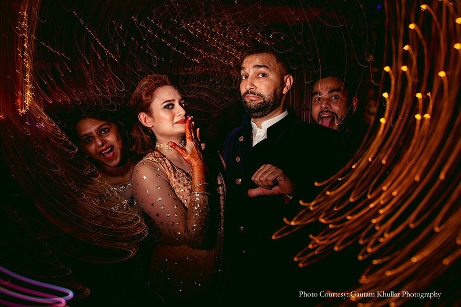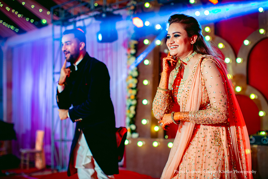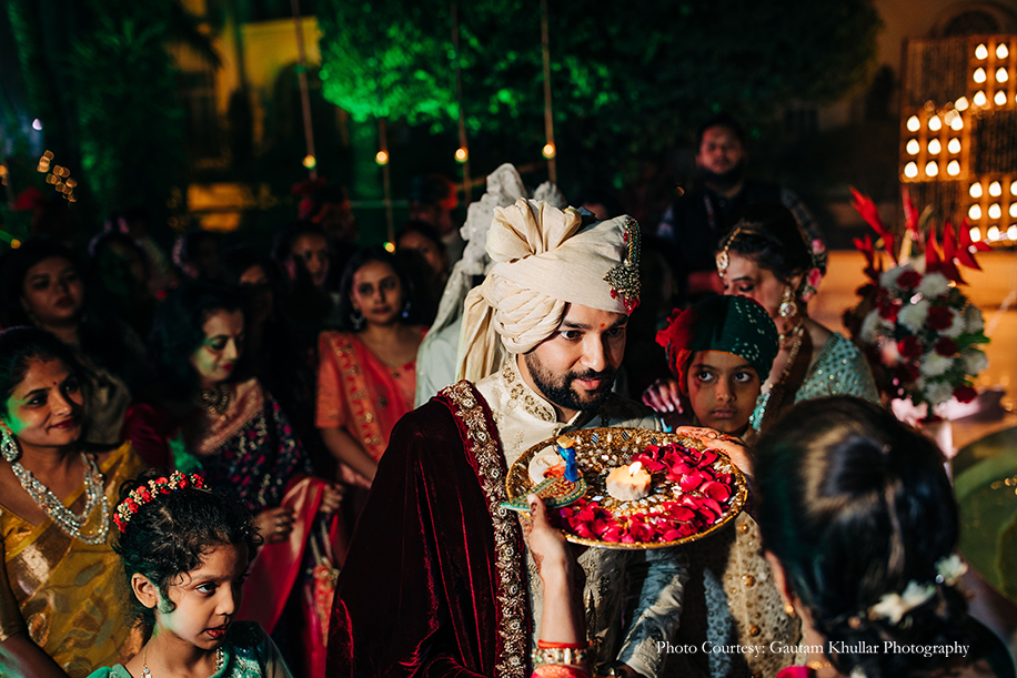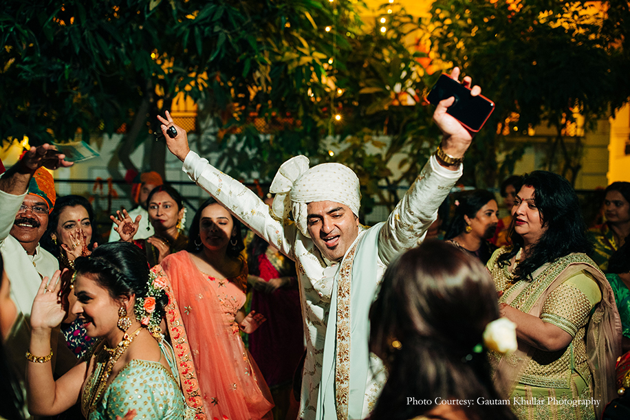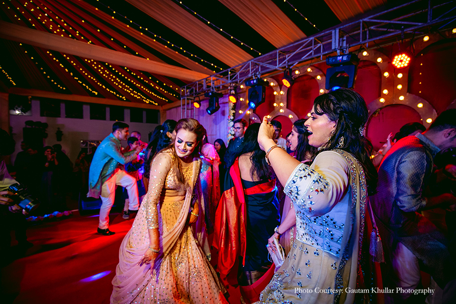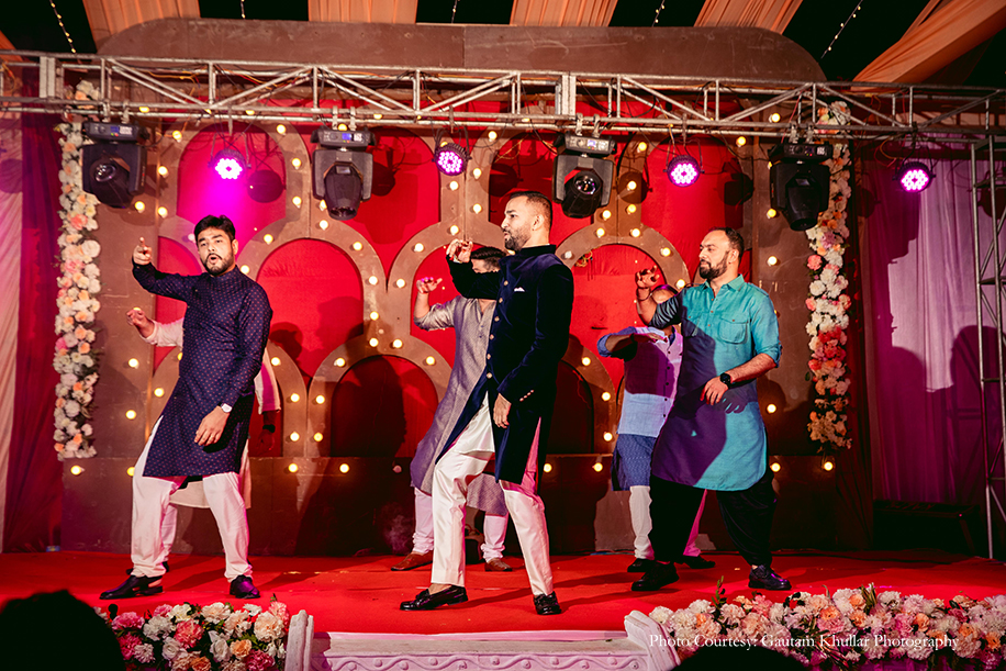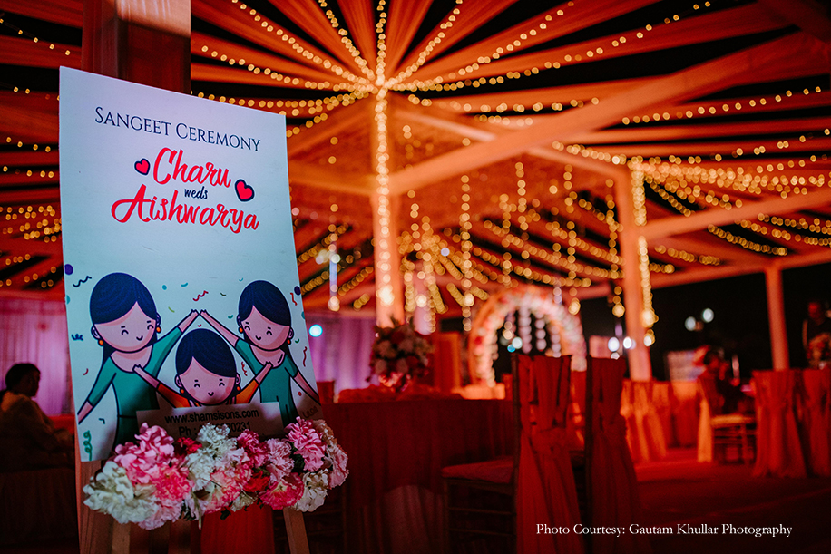 The sangeet was a glitzy occasion where all the family members of the couple, including the bride and groom, set the stage on fire. The flashing lights reflected off Charu’s peach lehenga studded with sequins as she twirled on the stage and showed off her best moves. Contrasting her look was Aishwarya in his deep blue velvet bandhgala. The decor was key to setting the mood right with its colorful lights that inspired everyone to dance.