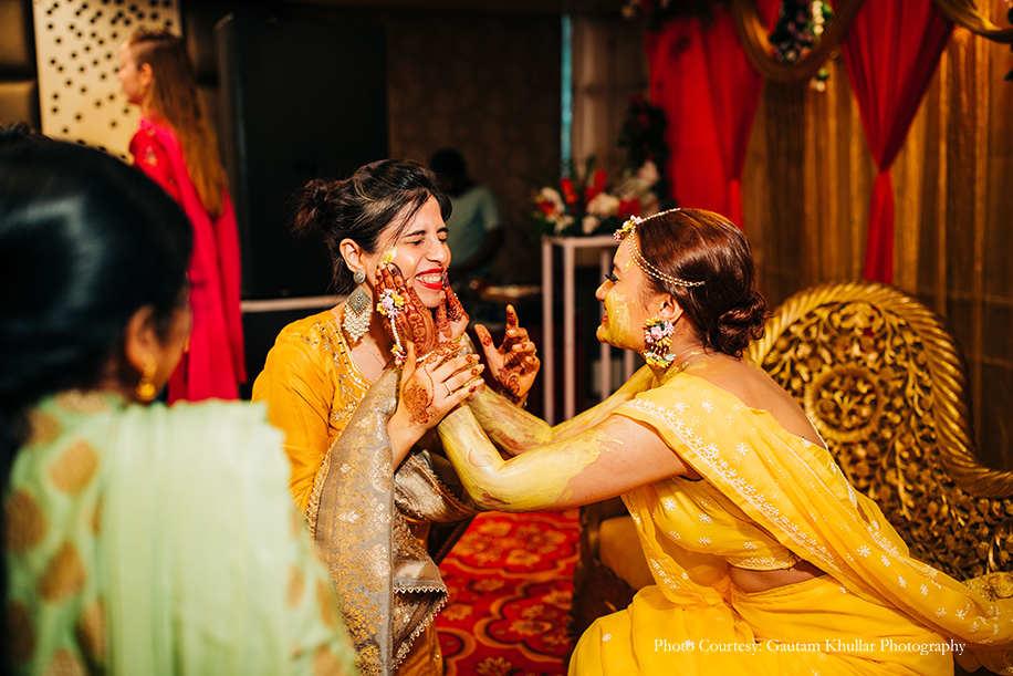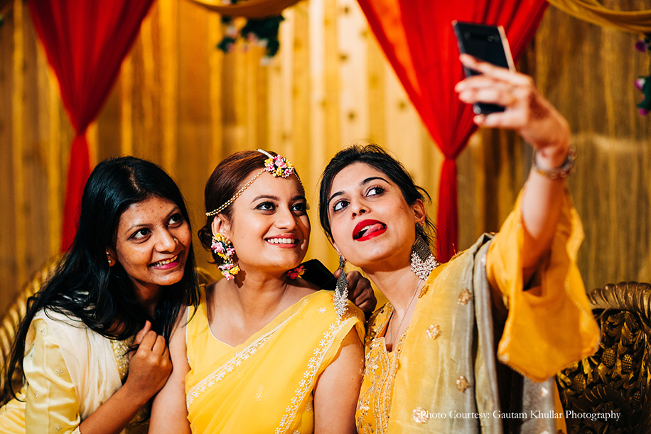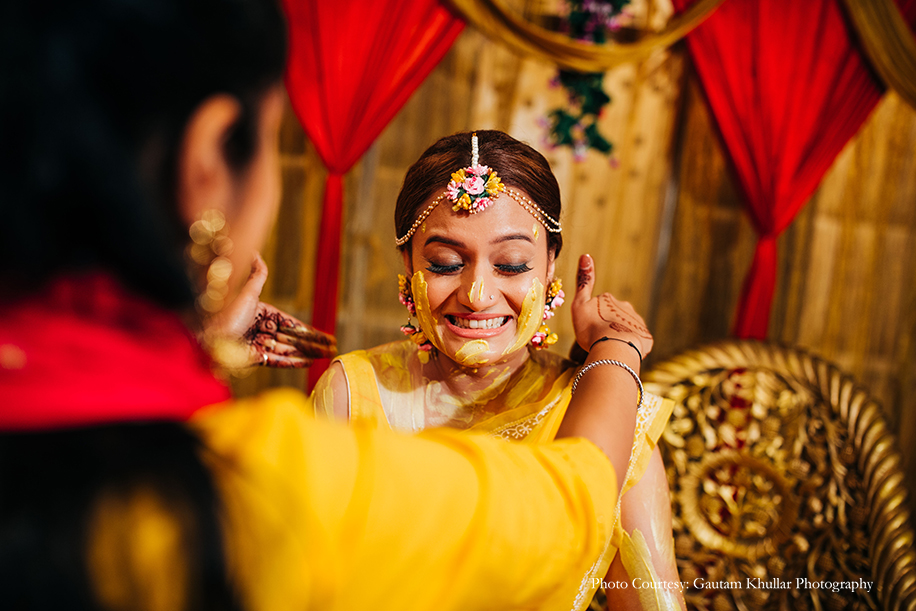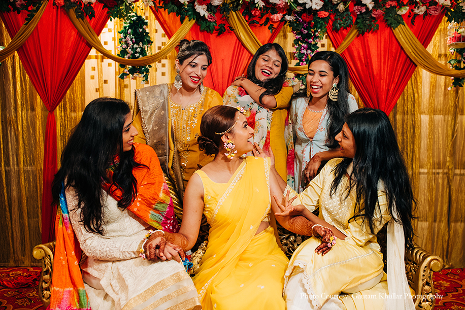 After the rocking sangeet, the haldi was a fairly calm affair that saw Charu sharing merry moments with her friends as they smeared her with turmeric. Staying true to tradition, she dressed in a yellow sari that complemented her complexion perfectly. Floral jewellery adorned her forehead, neck, and wrists, and she had a great time smearing turmeric paste on her friends too.