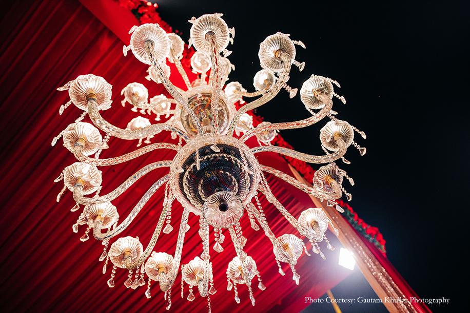 The wedding stayed true to its ‘Royal Crimson and Gold’ theme with palatial decor and twinkling lights. The bride looked radiant in her dark red lehenga with gold and pink floral embroidery. She went fairly light on the jewellery with a statement necklace, a minimalistic nose ornament and a ‘maang tikka.’ Aishwarya followed the Rajputana tradition and walked in wearing a white and golden sherwani with a dark red shawl to match his bride. He also carried a sword for this ceremony. The antique tapestries and chandeliers added an old-world charm to the venue and enhanced the regal ambiance of the event.