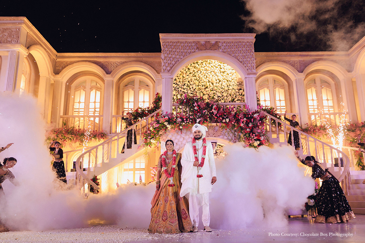 Akansh and Himanshu share, “Darshini and Sourabh’s wedding was a seamless blend of grandeur and emotion. The vibrant baraat, royal swagat, and cinematic varmala set a majestic tone, with Sourabh arriving on a regal chariot and Darshini making a breathtaking entry from a two-storeyed stage, framed by dancers and dramatic lighting. As fireworks lit up the sky and music soared, their garland exchange became a moment of pure magic.”