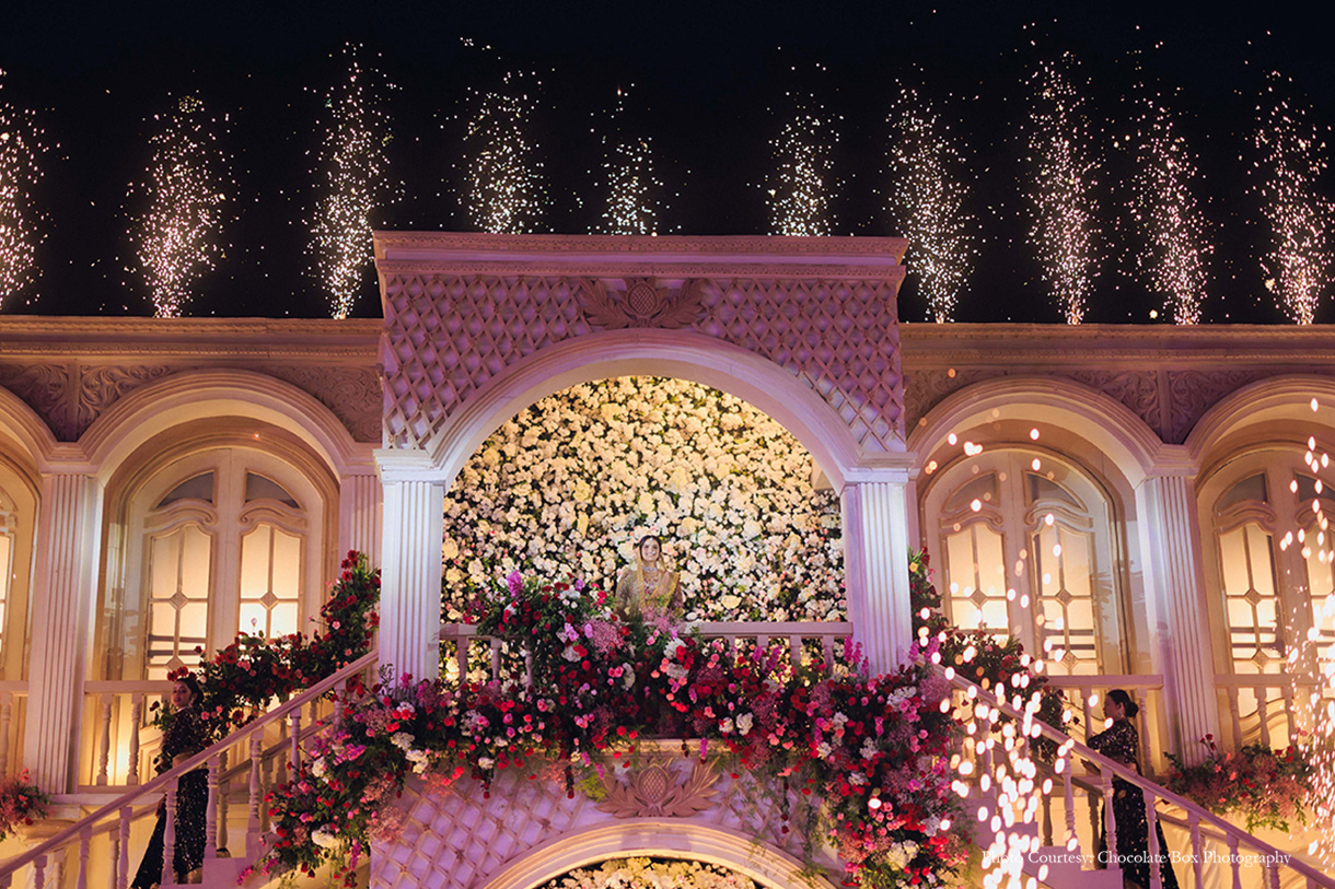 This dramatic varmala unfolded within the same palatial setup that later transitioned into their reception—a spectacular two-storey façade inspired by timeless European architecture. Designed with arched colonnades, an elegant double staircase, and refined ornamental detailing, the structure was envisioned as a single immersive world that carried the celebration from ritual to revelry. A soft white palette set an ethereal foundation, while mauve and plum florals cascaded along balconies and balustrades, adding depth without overwhelming the classic symmetry. Sowmya and Sakthi share, “This set was crafted as a visual metaphor, a palace not built of stone alone, but of two individuals who bring together creativity and grace.” The integrated layout also featured a specially designed varmala pathway that ensured controlled access and a dramatic, seamless entry—allowing the couple’s celebratory moments to flow effortlessly within one grand, unified space.