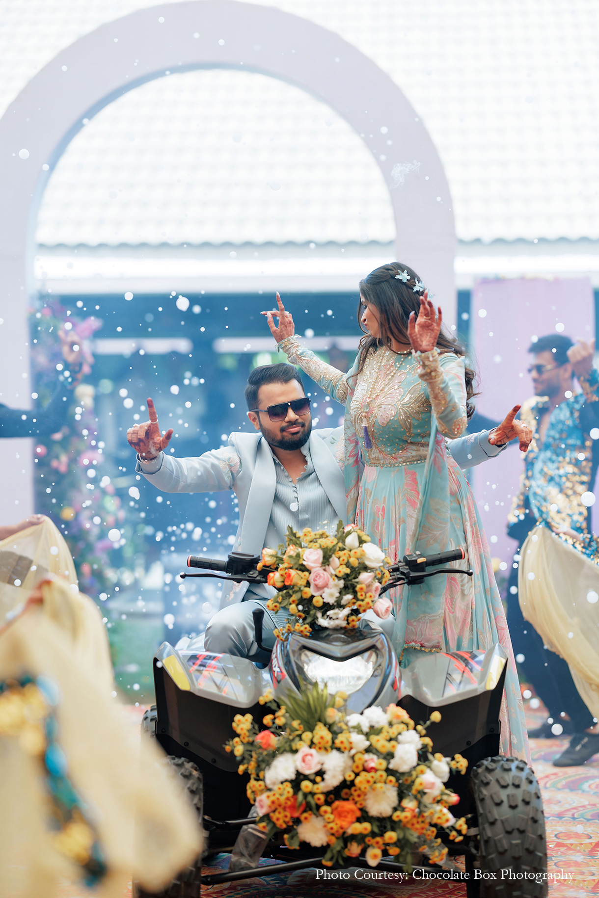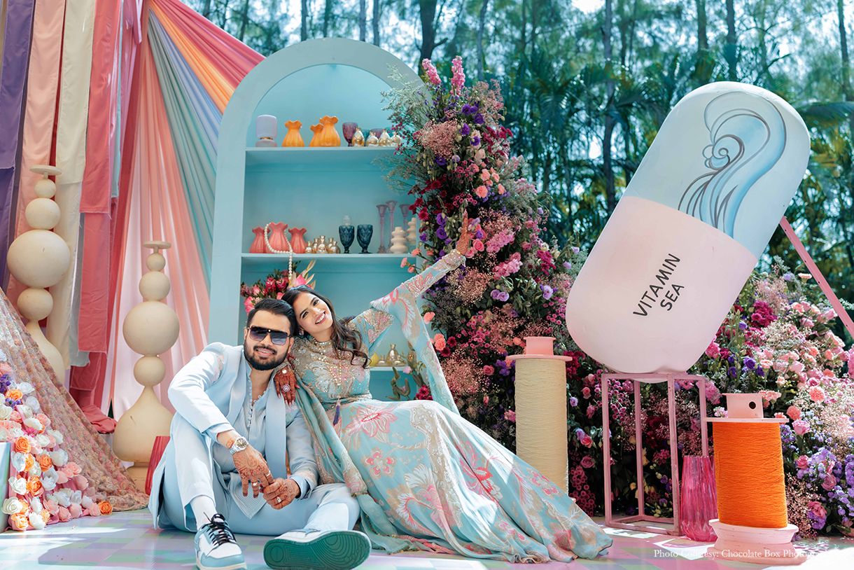 Akansh and Himanshu share, “The ‘Around the World Carnival’ was a burst of vibrant energy and personal touches. From Darshini and Sourabh’s ATV entry to the custom décor inspired by their professions, every element was thoughtfully curated.” What began as a high-spirited carnival gradually transitioned into an evocative haldi experience, retaining the same design language while deepening the emotional resonance.