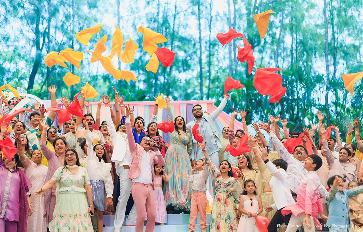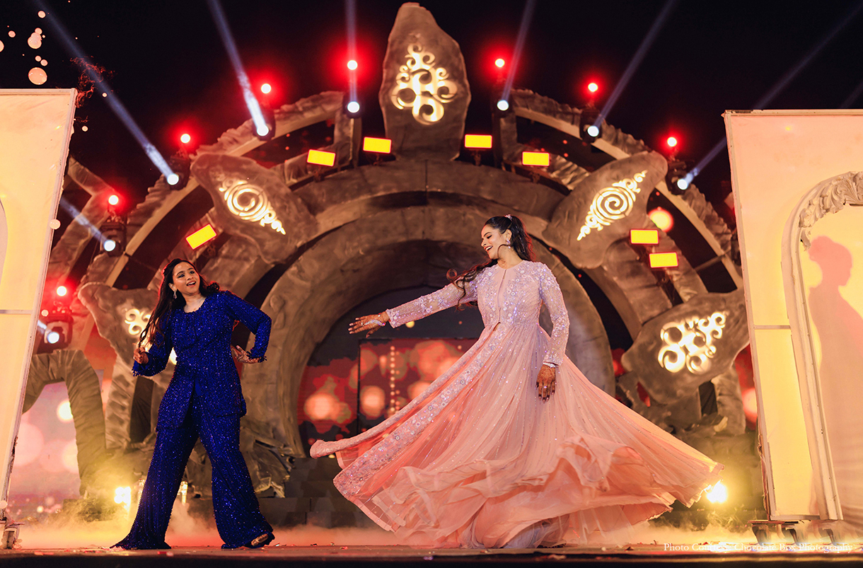 The Sangeet unfolded as a high-energy spectacle inspired by the atmosphere of global music festivals. Akansh and Himanshu share, “Darshini and Sourabh’s Sangeet was a high-voltage celebration inspired by a Music Fest theme. With a towering 24-foot stage, dramatic fire effects, and show-stopping performances. The evening featured a grand entry, a spectacular sword cake-cutting, and unforgettable moments that perfectly captured the couple’s vibrant spirit.”