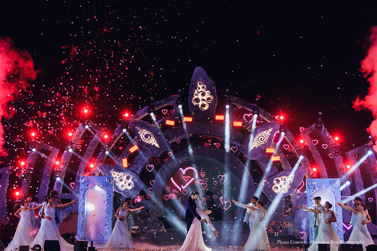 The design team elevated this vision with a Tomorrowland-inspired structure. This 24-foot cave-like installation glowed from within, creating the illusion of a concert arena on the beaches of Chennai. Despite heavy winds, uneven lawns, and the need for swift on-site assembly, their production teams engineered a set that was both sturdy and transportable, supported by extensive scaffolding. The result was a visually striking, high-energy environment that left guests feeling like they were part of a global festival.