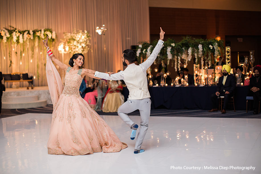 “The reception theme was designed to replicate a romantic evening at a city park. We both love living in the city and we fell in love with Yanni’s street lamp decor. We incorporated that theme with a park bench and lots of greenery and neutral florals in light peach and ivory to set the scene. Our first dance was very important to us as it was our way of showcasing our love for each other through our shared passion for dance. We fused two wildly different forms, ballroom, and bhangra, into a single piece of performance art.”