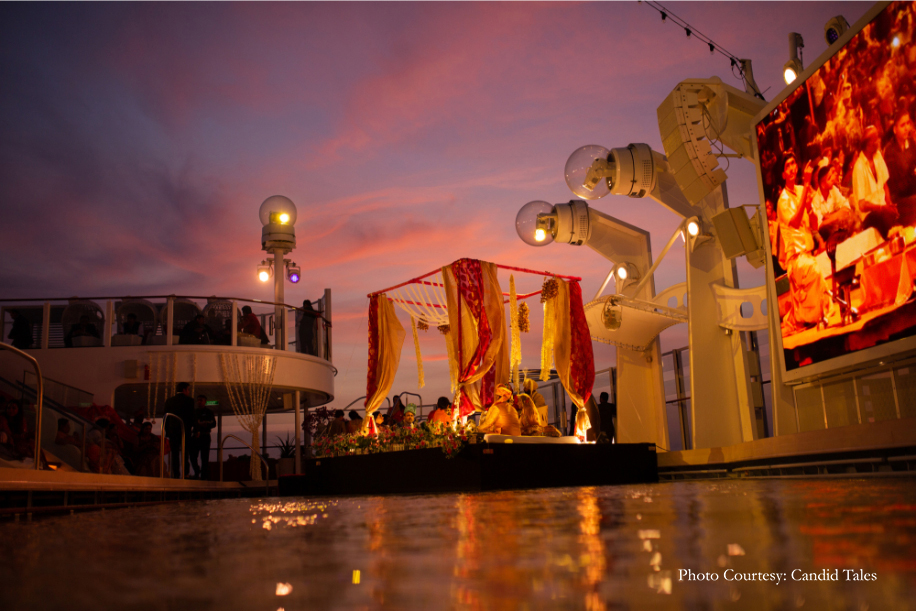 The themes for the wedding were planned keeping in mind the dynamics of a moving ship. The vast blue ocean extended as far as eyes could see; and the distant sight of mountains and occasional docks gave the venue an edge over conventional landlocked wedding locations. The limitations that come with hosting a cruise wedding inspired the wedding planners to come up with innovative and budget-friendly ideas which made the whole experience even more special for everyone involved.