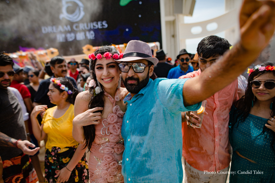 The amenities available on the luxurious cruise included a pool and that was reason enough to host a ‘Fun Euphoria’ themed pool party. The decor and setup were kept light and colorful to match the natural vibe surrounding the cruise. The couple chose pastel outfits for the party and had a blast as they danced with their loved ones.