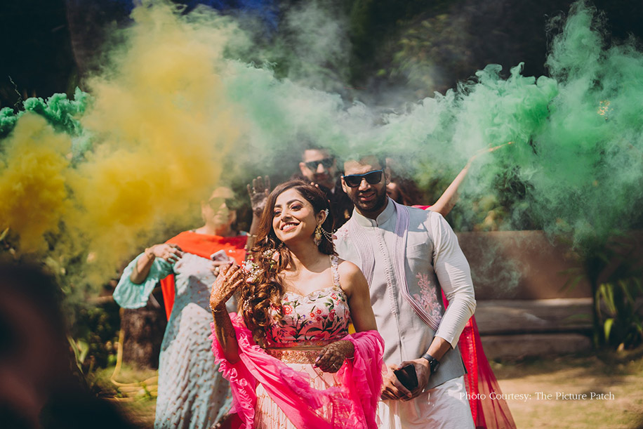 A breezy and sunlit function, the mehndi was celebrated at one of the venue’s sprawling lush lawns where everyone basked in the sun while getting henna patterned on their hands. Making a smashing entry to colorful smoke bombs, the couple donned coordinated outfits for the occasion.