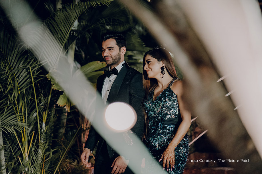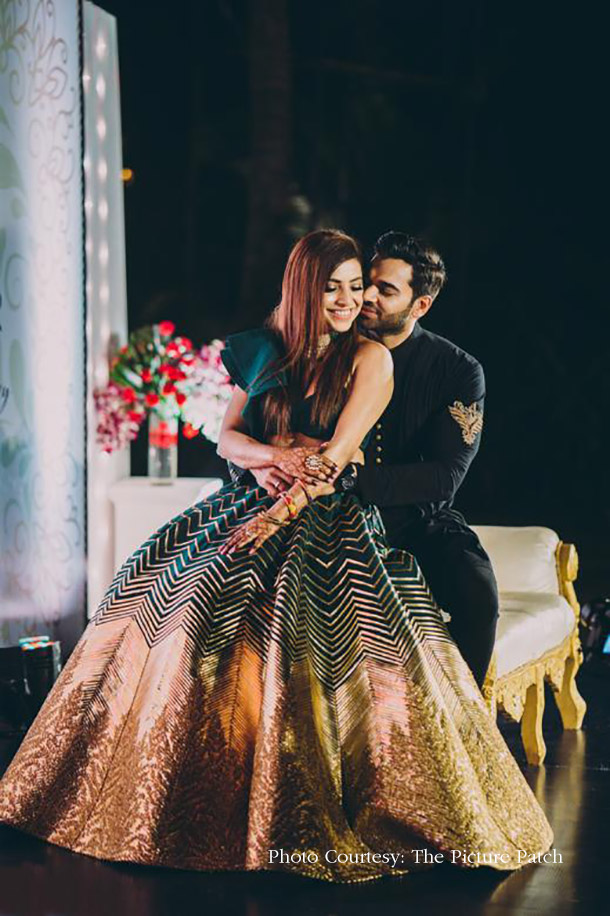Dressed in a chevron printed, one-shoulder green, and gold lehenga, Dheera was the epitome of glamor while Sunny contrasted her in a black contemporary sherwani.